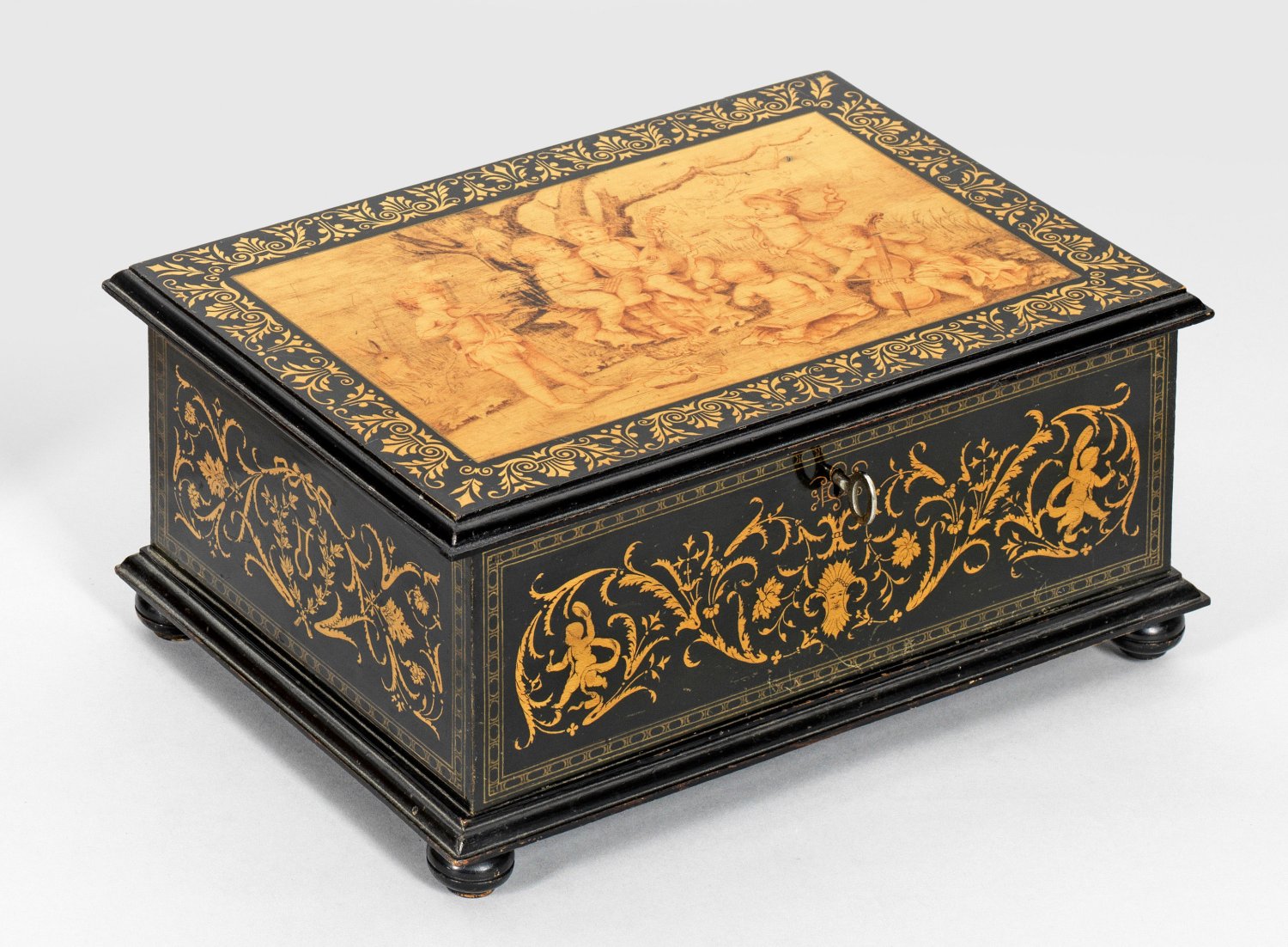 Ahorn, furniert und ebonisiert. Rechteckiger Korpus auf gedrückten Füßen. Profilierter Flachdeckel mit Darstellung von musizierenden Puttenkindern. Dekor aus Blattvoluten. Unterhalb bez. Weihnachten 1888 sowie leere Medaillonreserve. H. 13 cm. 29 cm x 20 cm.