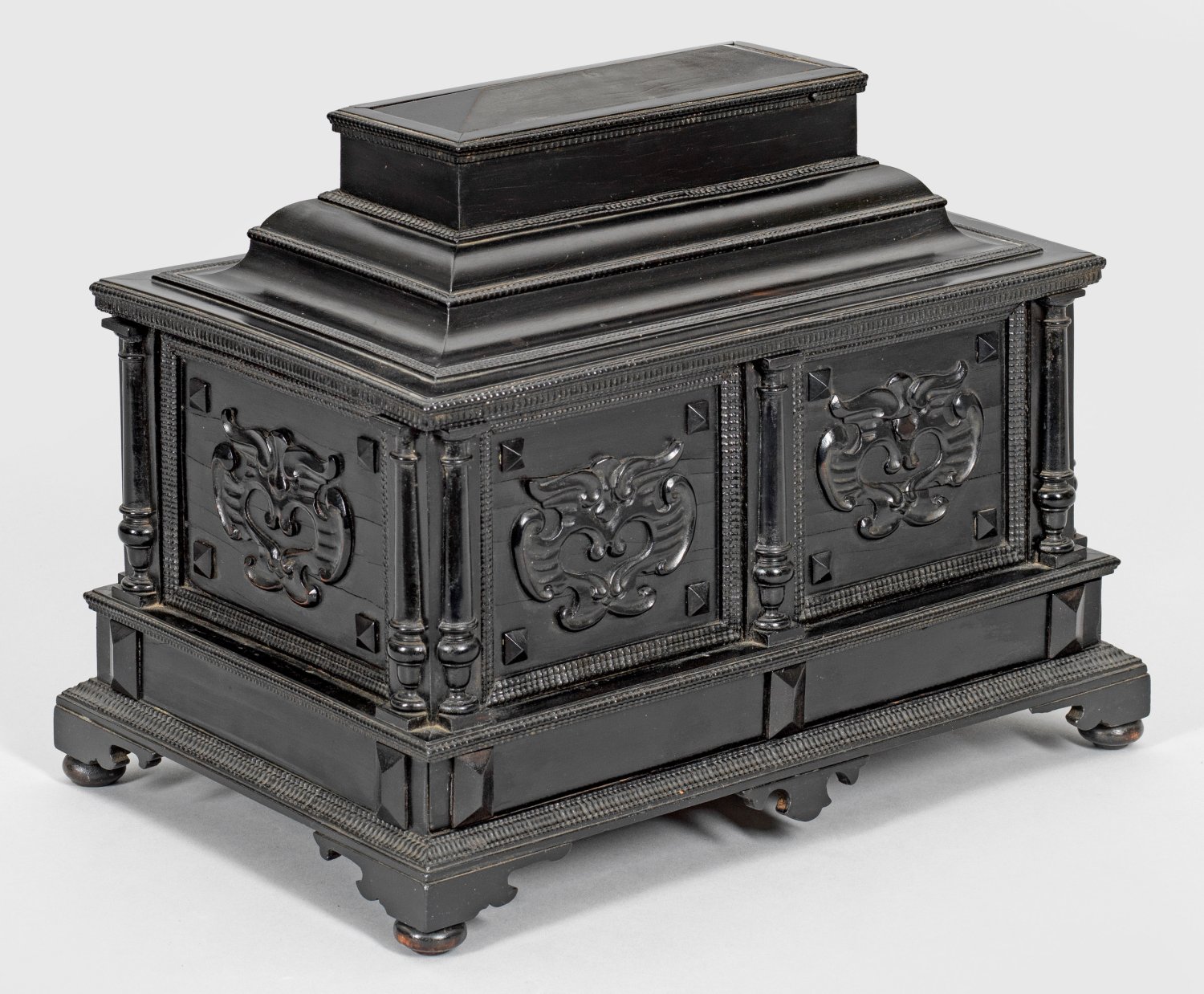 Holz, ebonisiert. gerader, querrechteckig angelegter Korpus auf schmaler Zarge aus Flammleisten sowie gesägten Füßen. Allseitig korrespondierende Reserven mit stilisierten Maskarons, flankiert von Halbsäulen. Gestuft ansteigender Deckel mit aufwändigem Geheimverschluss sowie podestförmigem oberen Abschluss. Innen herausnehmbares Ablagefach sowie diverse Geheimfächer. H. 27 cm. 35 cm x 23 cm.