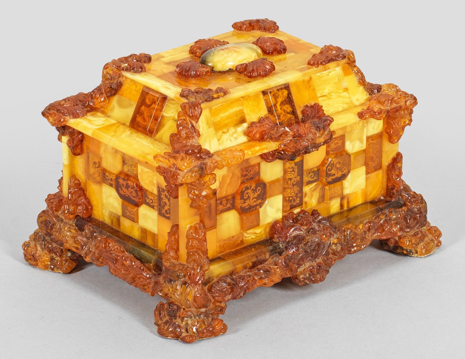 Heller, dunkler, transparenter sowie flammiger Bernstein, partiell geschnitzt und graviert. Stark reliefplastisch gestaltete, abgesetzte Sockelzone mit Akanthusblattdekor auf vier volutierten Füßen; zurückgesetzter, rechteckiger Korpus; scharnierter Deckel mit ausgestelltem Rand und zentral konisch aufgewölbt. Die Oberseite des Deckels mittig dekoriert durch einen milchigen, ovalen Bernsteincabochon in goldgelb bis hellgrün changierenden Tönen, kreuzförmig umrahmt von vier muschelähnlich geformten Applikationen. Die Wandungsseiten in architektonischer Weise gestaltet aus mauerwerkähnlich angeordneten, rechteckigen Segmenten in unterschiedlichsten Farbvarianten mit teilw. facettierten Kanten und Abschrägungen. Deckel und Korpuswandung unterteilt von dunkelhonigfarbenen Bernstein Panelen, teilw. kreuzförmig angeordnet, rücks. dekoriert mit fein gravierten Akanthusblattranken. Ecken und Kanten entsprechend der Sockelzone üppig umzogen und belegt von reliefplastischen Akanthusblattmotiven. H. 11,5 cm. 17,5 cm x 12, 5 cm.