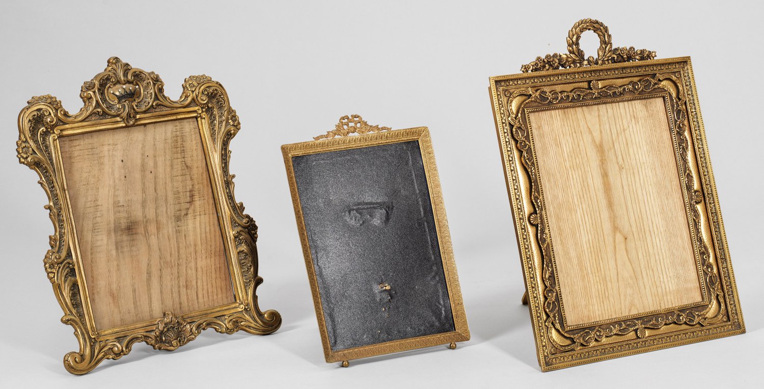 Bronze und Messing. Gerade, bzw. passig geschweifte Rahmung aus passig geschweiften Voluten, Blüten und Palmettenfriesen. 1x mit applizierter Adelskrone. Rückseitig klappbare Aufsteller. 20,5 cm x 30,5 cm; 37 cm x 30 cm; 42 cm x 30 cm.
