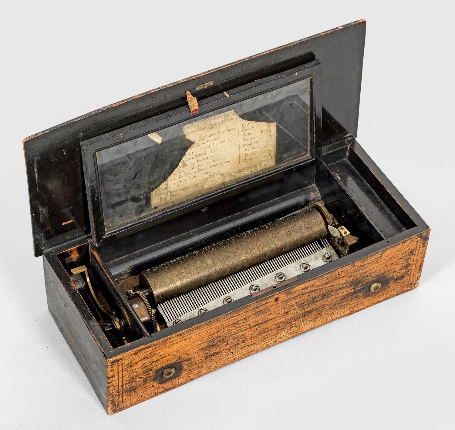 Nussbaum, furniert und teilw. in Maseroptik gefasst. Gerader Korpus mit aufklappbarem Deckel. Innen Walzenspieluhr mit Zahnradaufzug und besch. Melodienkamm. Acht Melodien. Seitlich zwei Betriebshebel. H. 14,5 cm. 51 cm x 22 cm.