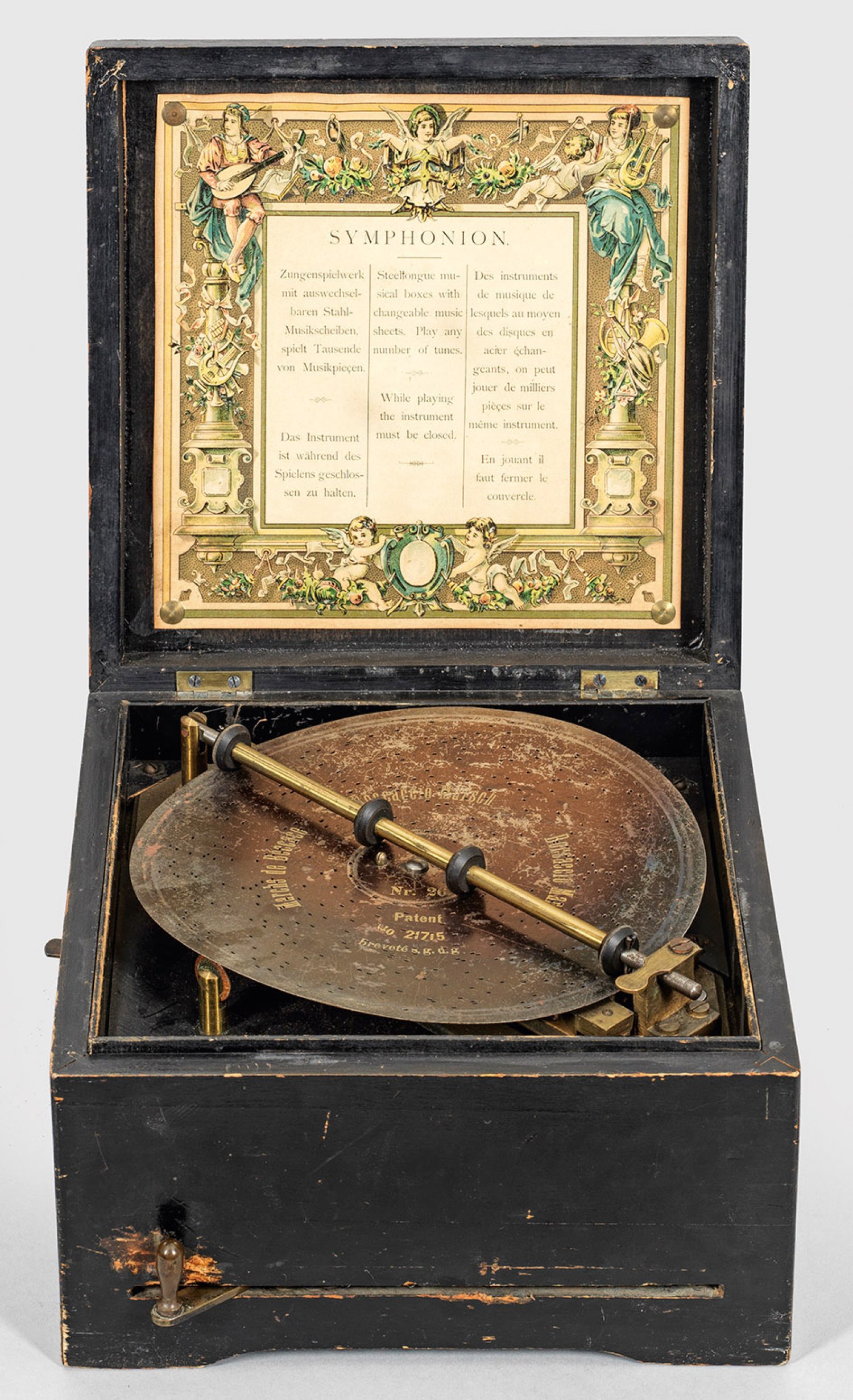 Holz, ebonisiert und polychrom staffiert. Gerader, rechteckiger Korpus mit entsprechendem Deckel. Spielwerk mit zwei Tonkämmen, frontseitigem Aufzugshebel und seitlichem An- und Absteller. Herstellerzeichen. Dazu 39 Lochplatten unterschiedlicher Hersteller. Überholungsbedürftig. H. 19 cm. 32 cm x 29 cm.