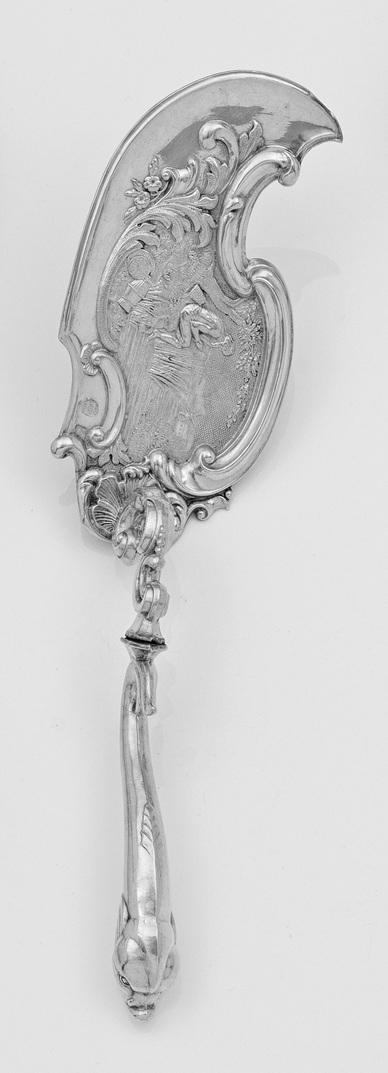 Silber. Passig geschweifter, von reliefplastischen C-Schwüngen gerahmter, flacher Heber mit szenischer Darstellung eines Anglers am Teich. Mehrfach volutierter Griff in einem stilisierten, vollplastischen Delfin endend. Gest., 13 Lot, dat.; bisher unidentifzierte Meistermarke "AB". Gew. ca. 90 g. L. 27,5 cm.