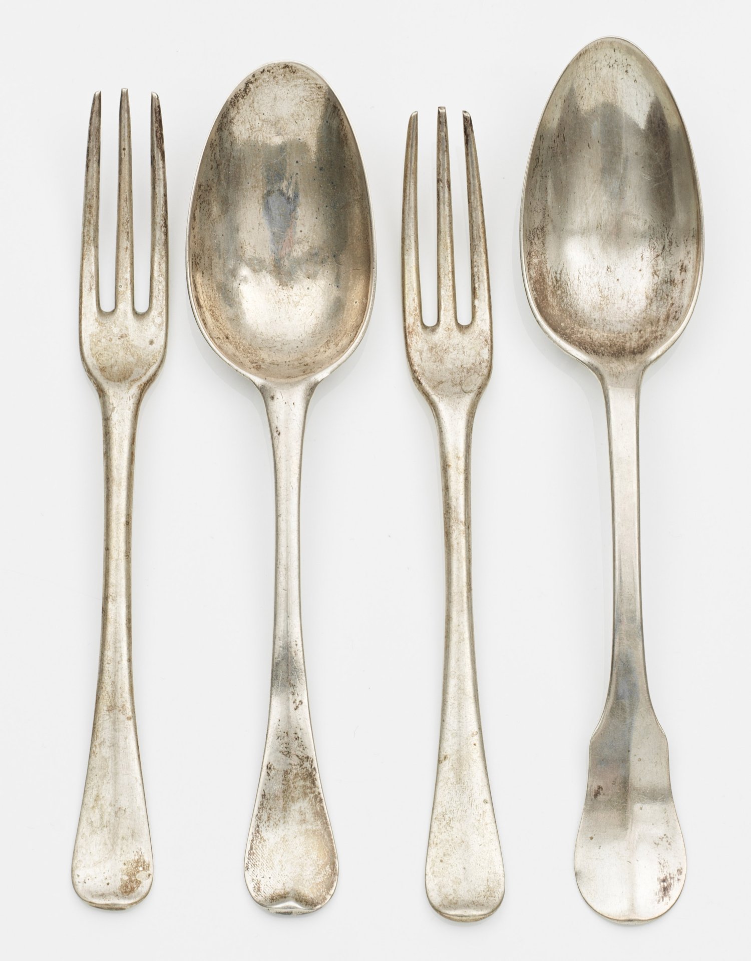 Silber. Flaches, konisches und am Ende leicht gewölbtes Heft sowie dreizinkige, lange Laffe, übergehend in gerundeten Griff. Gest., Löffel: Meister Martin Friedrich Selchow (Selschopp) (wird Bürger 1709) sowie Jahresbuchstabe "y", Meister Arnold Hubert Moeren (wird Meister 1747). Gabeln: Gest. 12 Lot, Jahresbuchstabe "B", Meister Georg Carl Brenner (wird Meister 1754). Gew. zus. ca. 210 g. L. 19 cm - 21 cm.