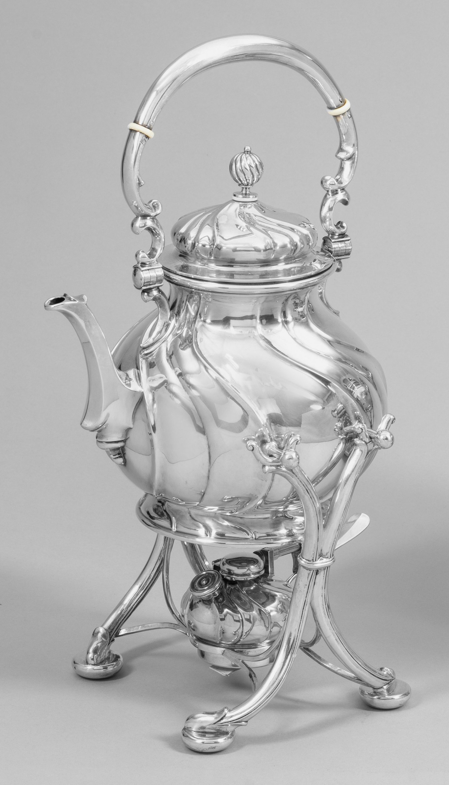 Silber. Über vier runden, gewölbten Füßen gebogtes Gestell. Darüber bauchige Kanne, seitlich mit je zwei angebrachten Stiften als Aufhängung im Gestell. Übergreifender, beweglicher und volutierter Henkel über bombiert aufgewölbtem Scharnierdeckel. Wandung, Deckel und Kugelknauf umlaufend verziert mit passig geschweiften, in sich gedrehten Zügen. Kurzer, am Ansatz konsolartiger Röhrenausguss. Gest. 800, Herstellerzeichen, Händlermarke "C. Kumpe`s WWE". Gew. ca. 2025 g. H. 42 cm.