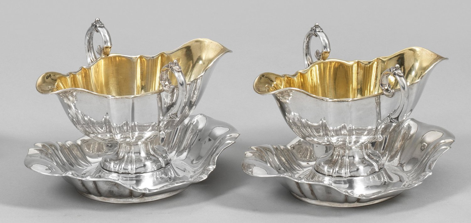 Silber. Über ovaler, gemuldeter und abschraubbarer Standfläche schiffchenförmige Sauciere mit beidseitig hochgezogenem Ausguss und zwei Ohrenhenkeln. Wandung und Schale umzogen von passig geschweiften Zügen. Innen vergoldet. Gest. 800, Herstellerzeichen, Händlermarke "Posen". Gew. zus. ca. 745 g. H. 13,5 cm. L. 22 cm.
