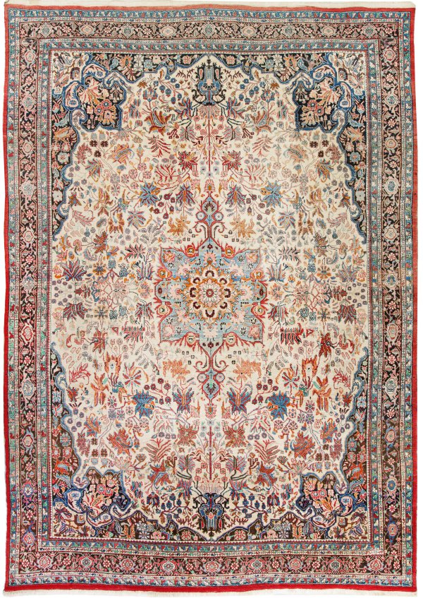 Persien. Um 1960. Wolle auf Baumwolle. Auf cremefarbenem Fond zentrales, hellblaues Medaillon mit Anhängern sowie breite dunkelgrundige Ecklösungen. Flächendeckend dichte Musterung aus großen Palmettenbordüren. Umlaufend schmale, dunkelgrundige Palmettenbordüre, flankiert von schmalen Bändern. 373 cm x 276 cm.