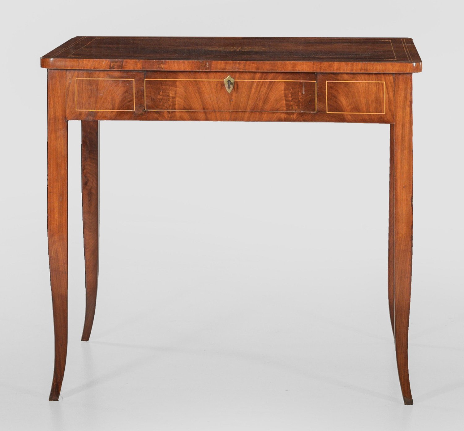 Mahagoni, furniert mit Einlagen aus Zitronenholz. Gerader, einschübiger Zargenkasten auf leicht ausgestellten Vierkantbeinen. Gering überstehende Deckplatte mit gerundeten Ecken sowie zentralem, intarsiertem Rosettenmotiv. H. 76 cm. 85 cm x 67 cm.