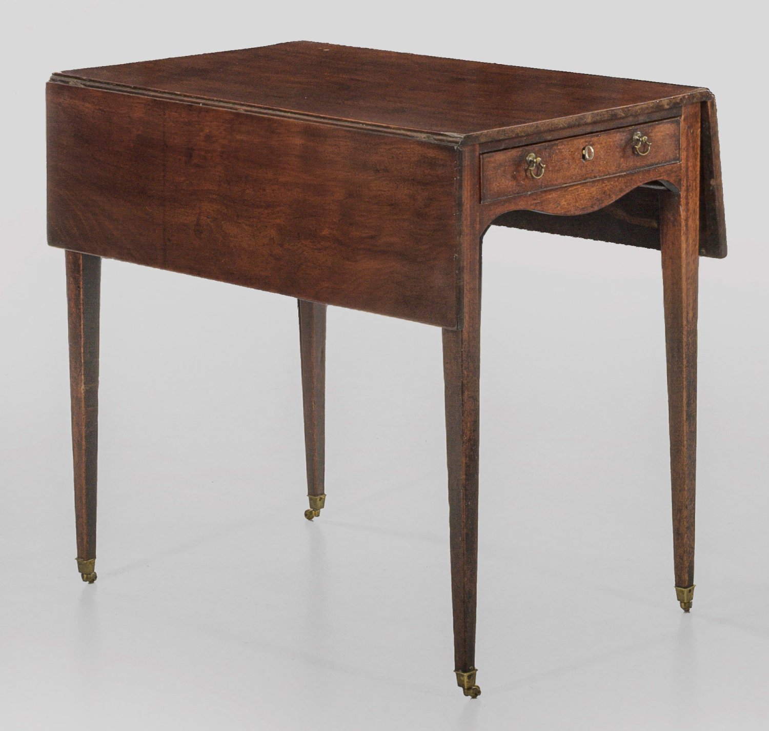 Mahagoni. Gerader, einschübiger Zargenkasten auf konischen Vierkantbeinen mit kleinen Messingrollen. Rechteckige, seitlich aufstellbare Deckplatte. H. 71 cm. 75 cm x 48/90 cm.