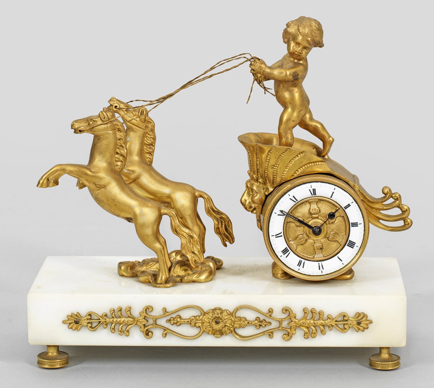 Bronze, vergoldet sowie weißer Marmor. Vollplastische Darstellung Amors im Wagen als Uhrengehäuse. Emailziffernring. Mechanisches Werk mit Handaufzug, bez. Swiss Lever Echapement. Unterhalb flacher Podestsockel. H. 20 cm. 21 cm x 9 cm.