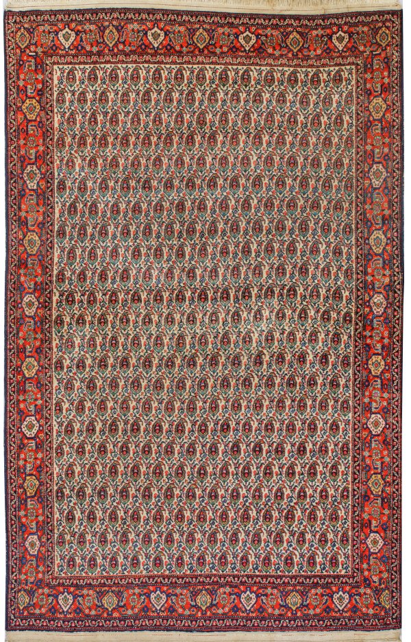 Persien. Wolle auf Baumwolle. Im elfenbeinfarbenen Innenfeld flächendeckende Musterung aus gereihten Bothéblüten im Rapport. Umlaufend rotgrundige Palmettenbordüre. 220 cm x 139 cm.