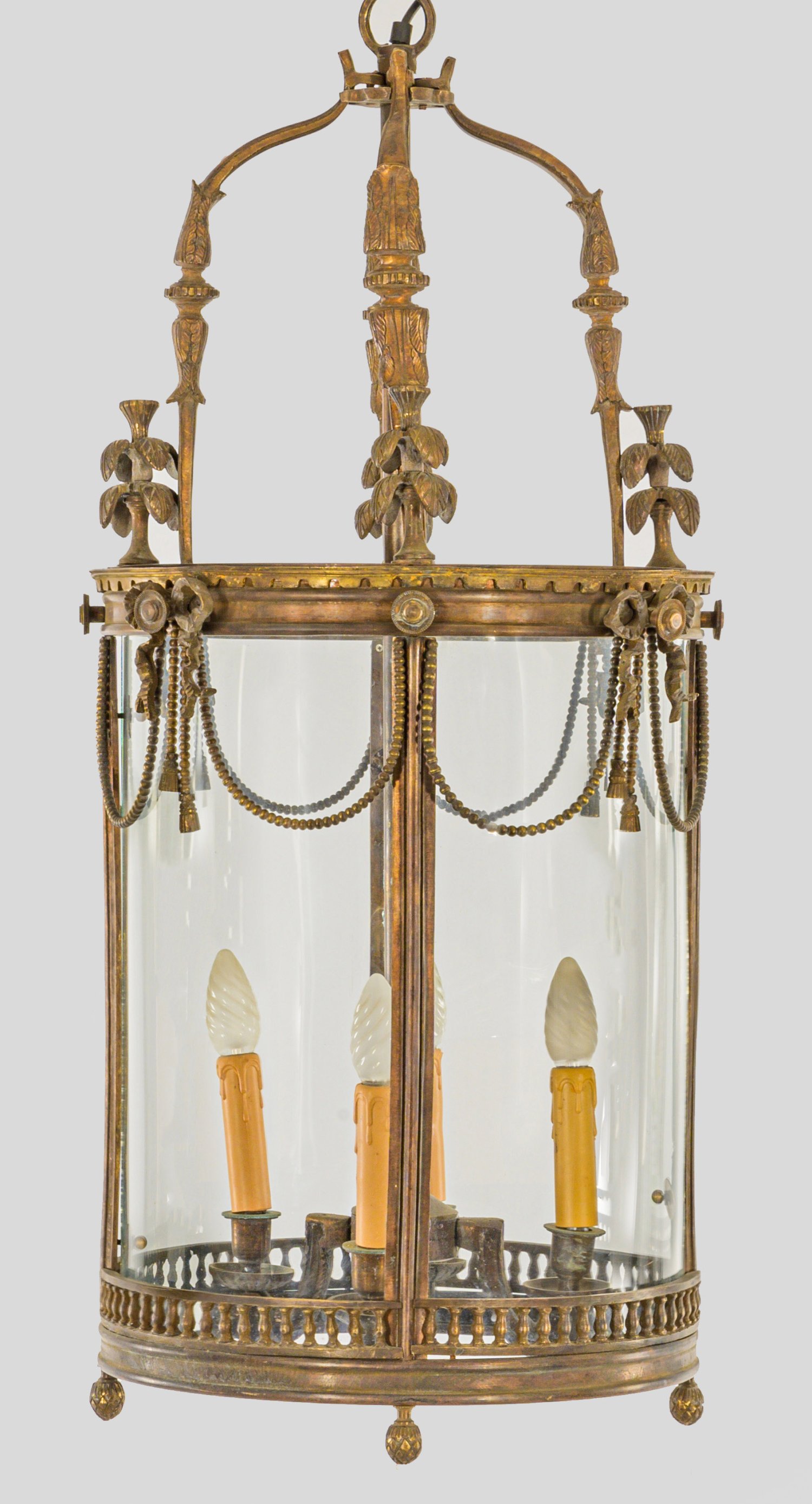 4-flg.; Bronze, dunkel patiniert. Zylinderförmiger Korpus aus schmalen Streben und profilierten Reifen, umgeben von Festons aus Perlschnüren. Oberer Abschluss aus stark geschwungenen Volutenmotiven sowie in der Mitte schlanker Schaft als Träger für Leuchtmittel. Bombierte Glaseinsätze. Elektrifiziert. H. 90 cm. D. 45 cm.