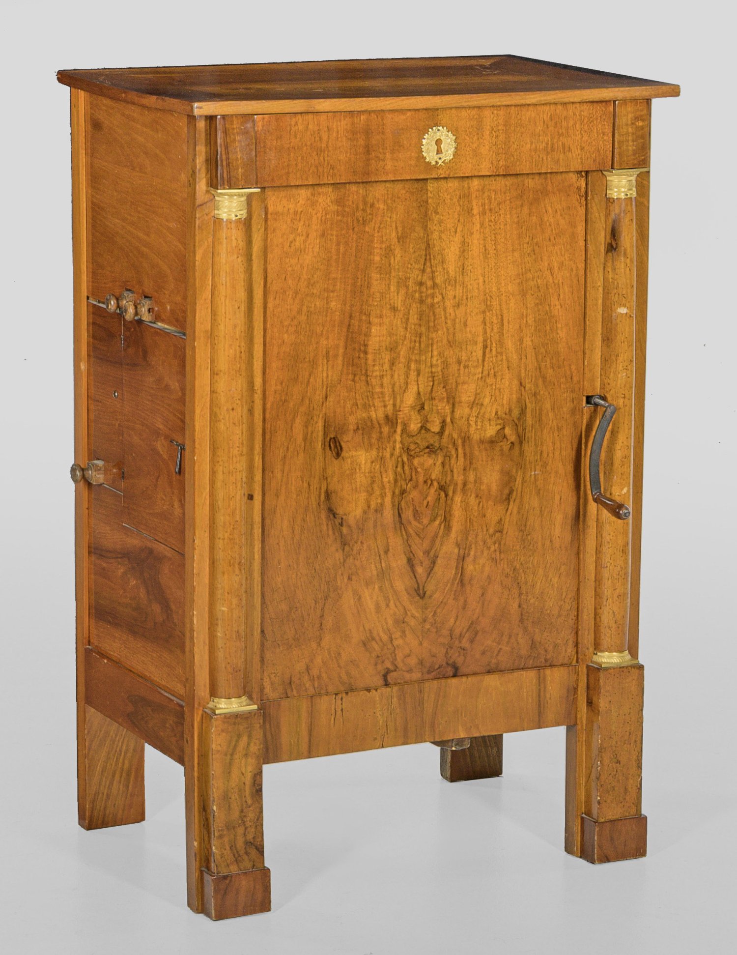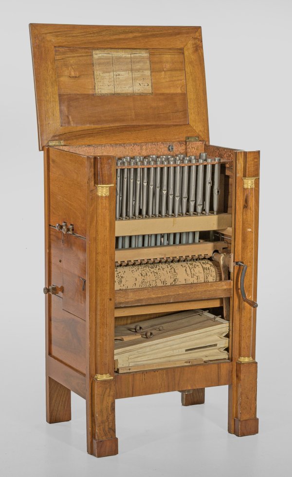 Nussbaum, furniert. Gerader, hochrechteckiger Korpus, flankiert von eingestellten Halbsäulen mit reliefierten Kapitellen aus Bronze auf hohen, gekanteten Füßen. Herausnehmbare Front sowie gering überstehende, aufklappbare Deckplatte. Holzwerk mit Metallflöten sowie Lederblasebalg. Insgesamt drei austauschbare Melodiewalzen, bez. F.G. Dumont et Fc. Clément. H. 92 cm. 61 cm x 40 cm.