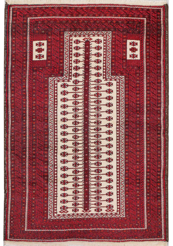 Persien. Wolle auf Wolle. Auf elfenbeinfarbenem Fond gekantete Nische mit stilisiertem Lebensbaummotiv. Umlaufend breite, vielteilige Ornamentbordüre. 135 cm x 100 cm.