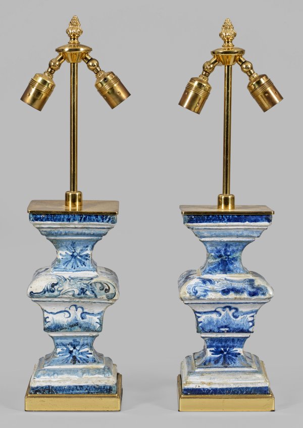 2-flg.; Fayence, cremefarben glasiert und in zweifarbigem Blau bemalt sowie Messing, vergoldet. Über gestuft ansteigender Basis kräftiges Balusterelement eines Hamburger Kachelofens des 18. Jhs.; Oberhalb schlanker Schaft als Träger für Leuchtmittel. Elektrifiziert. Rep.; H. 61 cm.