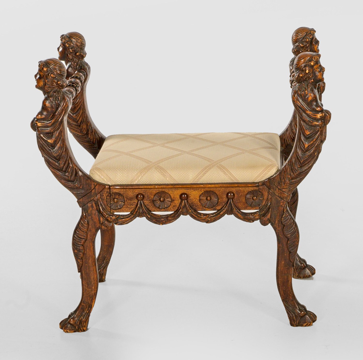 Nussbaum, reliefplastisch geschnitzt. Gerade Zarge mit reliefiertem Draperiewerk auf geschwungenen Beinen mit Tatzen. Weit ausschwingende Armlehnen aus vollplastisch gestalteten Hermenfiguren, durch gegliederten Balusterstab verbunden. Sitzfläche gepolstert und bezogen. H. 78 cm. 82 cm x 45 cm. Sitz-H. 46 cm.