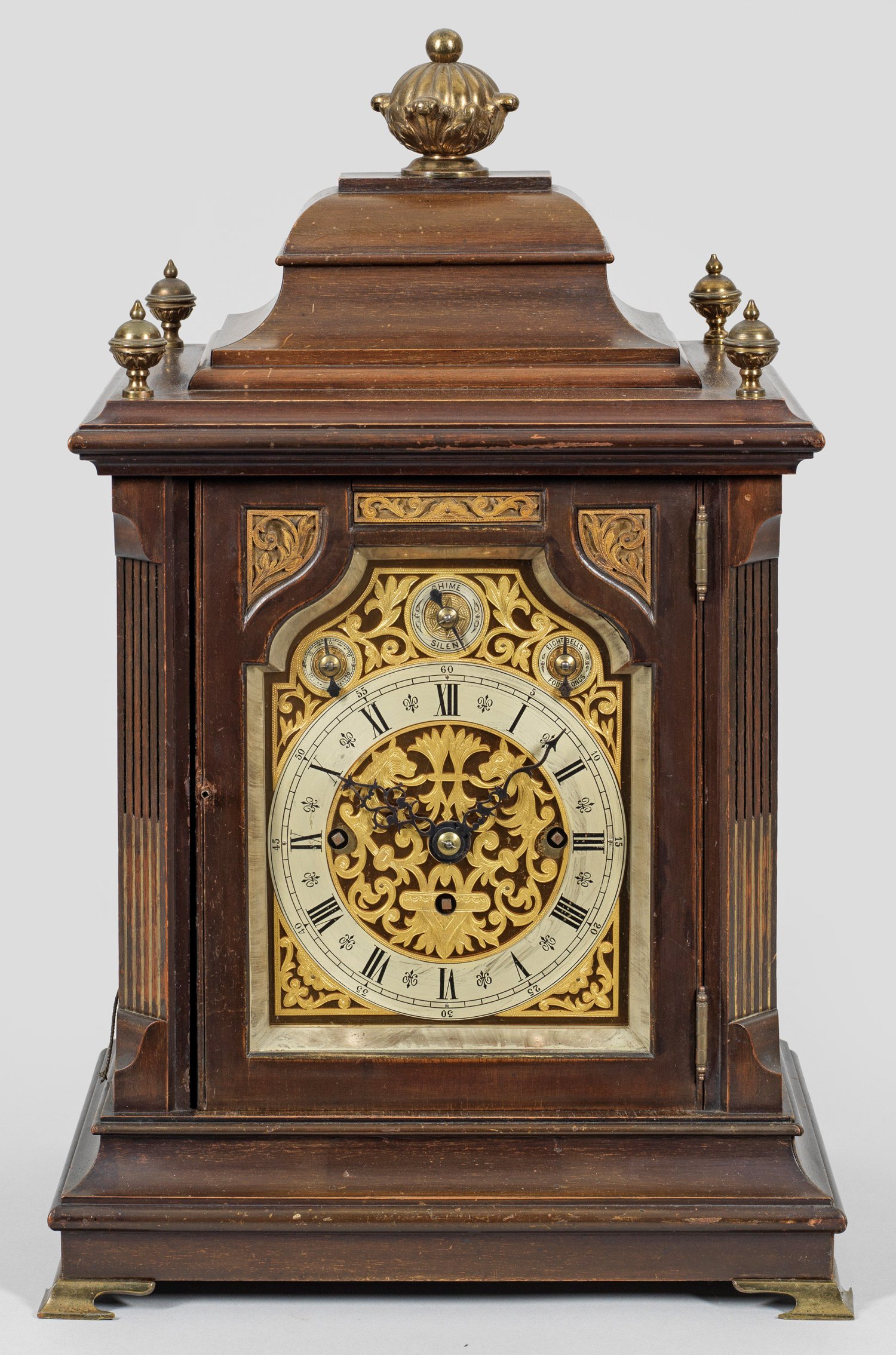 Mahagoni, furniert. Gerader, rechteckiger Korpus, flankiert von schräggestellten Ecklisenen auf gekehltem Sockel mit geschweift ansteigendem oberen Abschluss und Balusterbekrönungen. Verglastes, reich dekoriertes Zifferblatt mit Schlagab- bzw. Schlagumsteller. Präzisionswerk mit Kette und Schnecke sowie Viertelstundenschlag auf vier Tonstäben mit Westminsterschlag bzw. acht Glocken. Repetition. Herstellerzeichen W&H Sch.; H. 56 cm. 35 cm x 25 cm.