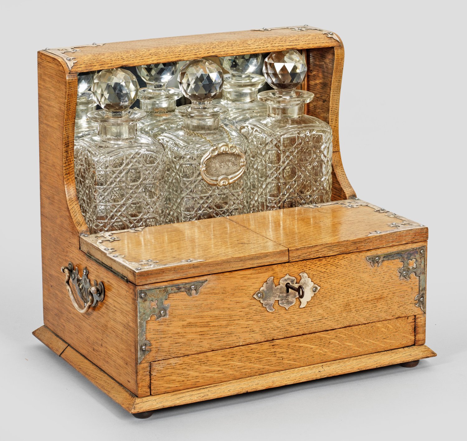 Eichenholz und farbloses Glas. Gerader Korpus mit seitlichen Handhaben auf gedrückten Füßen. Verspiegelte Rückwand, flankiert von geschwungenen Seitenwangen sowie drei Aussparungen für Karaffen. Davor aufklappbare Facheinteilung sowie schauseitig Schubfach mit verdecktem Mechanismus. Ornamentierter Beschlag aus versilbertem Messing. H. 33 cm. 35,5 cm x 27 cm.