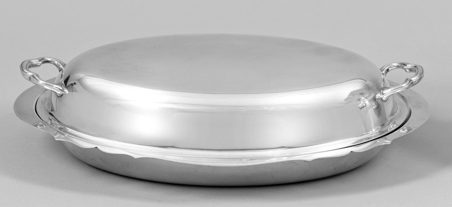 Sterlingsilber. Ovale, tief gemuldete Schale mit passig geschweiftem, ausgestelltem Rand. Aufgewölbter Deckel mit seitlich zwei blattförmigen, durchbrochen gearbeiteten Handhaben, ebenfalls als Schale verwendbar. Gest. Sterling, Herstellerzeichen. Gew. ca. 920 g. H. 7 cm. 29,5 cm x 21 cm.