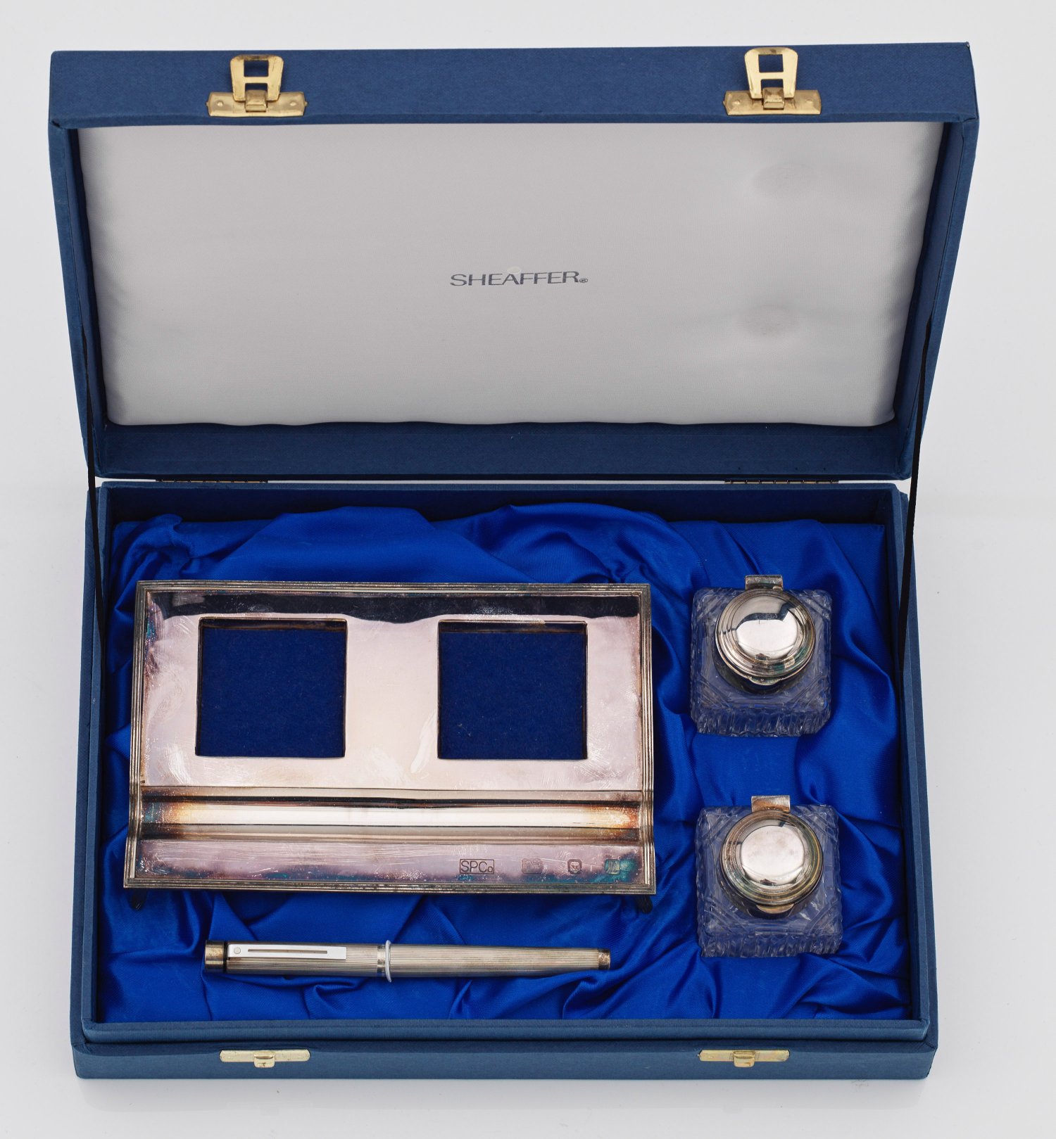 in Original-Box. Sterlingsilber, farbloses, geschnittenes Kristallglas. 4-tlg.; Zwei Tintenfässer, rechteckiges Tableau sowie Füllfederhalter. Das Tableau mit Aussparungen für die Tintenfässer und zur Ablage des Stiftes. Füllfederhalter mit 14 k-Goldfeder. Gest., Beschauzeichen, Herstellerzeichen, Jahresbuchstabe "M". H. 6,5 cm. 17,7 cm x 11,5 cm.