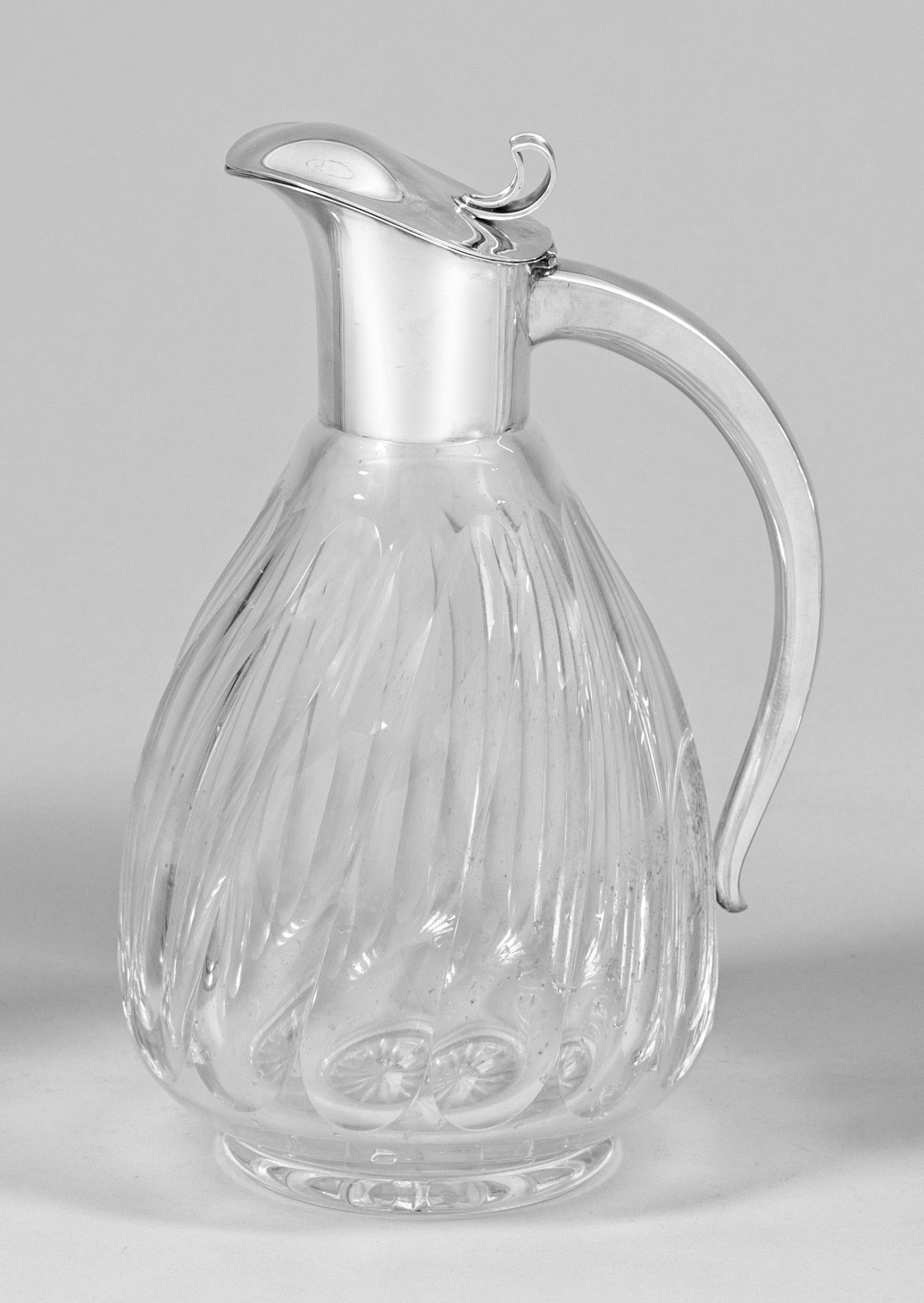 Farbloses Kristallglas mit Silbermontierung. Birnförmiger Korpus, übergehend in schmalen Hals mit glatter Montierung, scharniertem Deckel, durchbrochen gearbeiteter Daumenrast und gerundetem, konischem Henkel. Wandung umlaufend verziert mit geschliffenen, in sich gedrehten, zungenfriesähnlichen Kanneluren. Gest. 835, Herstellerzeichen. H. 22 cm.