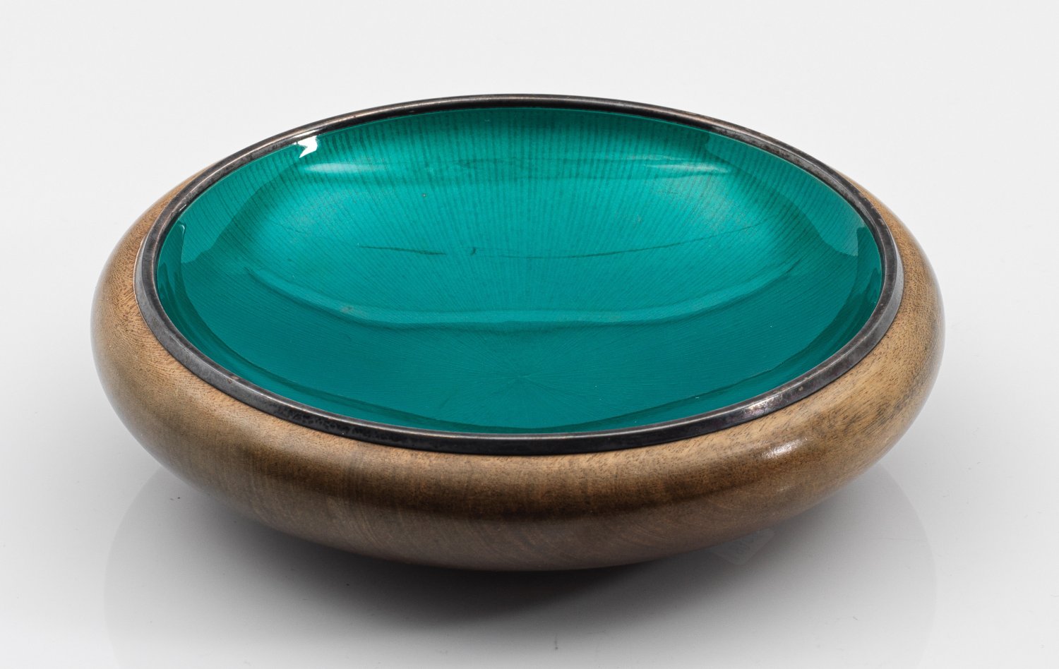 Mahagoni und Sterlingsilber, teilw. emailliert. Runde, gedrechselte Holzschale. Darin eine montierte Silberschale mit gering gemuldetem, strahlenförmig guillochiertem und transluzierend blau-grün emailliertem Spiegel. Mit Herstelleretikett. Gest. 925, Herstellerzeichen. H. 5,3 cm. D. 19,5 cm.