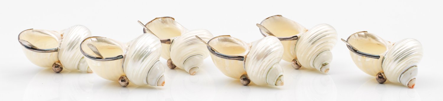 Perlmutter und Sterlingsilber. Elegant gedrehte Schneckenhäuser, umgedreht als Saliere nutzbar. Der Rand mit Silber verziert, auf dem Gehäuse eine applizierte Silberperle. Sechs passende Löffel. Originale Händlerverpackung von Hamilton & Inches, Edinburgh/London. Gest. 925, Beschauzeichen, Herstellernummer "987". H. 3,5 cm. 6,2 cm x 4 cm.