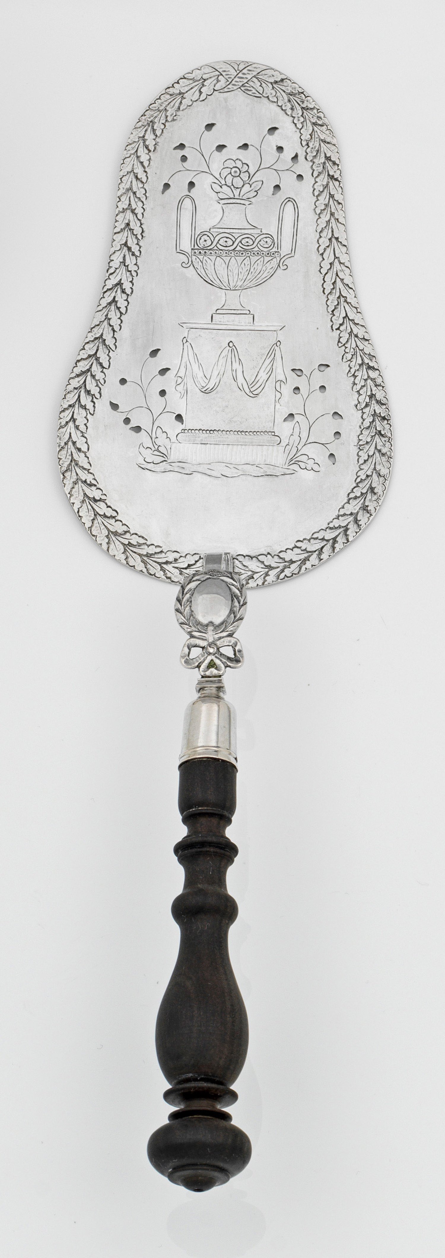 A German Neoclassical silver lifter with wooden handle by Johann August Arnold II (master since 1757). Standard mark 12 lot, test, assay and master´s mark.