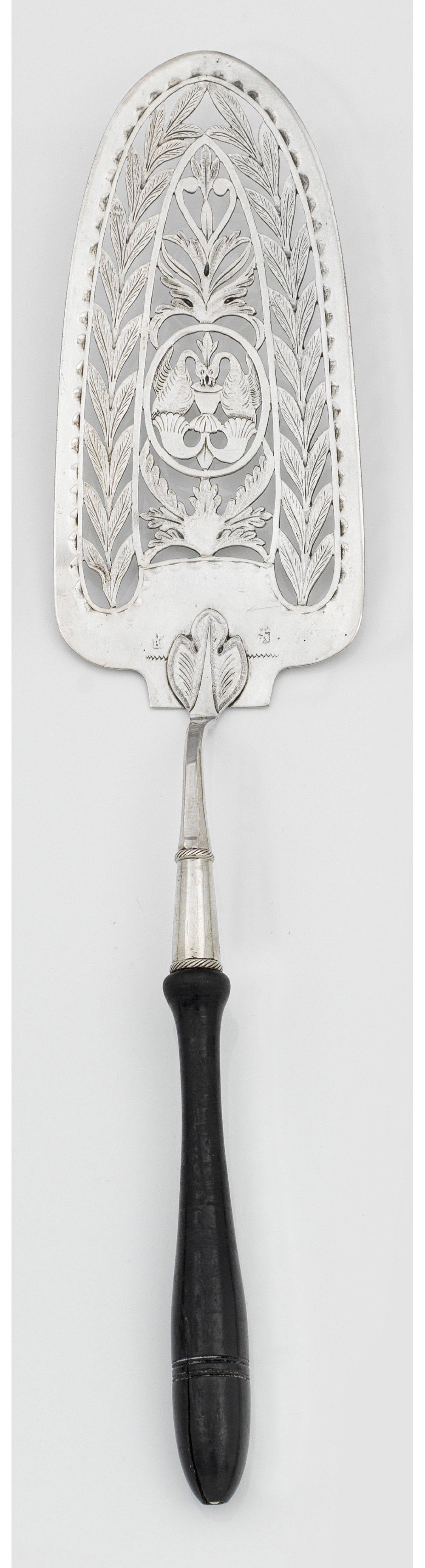 Silber. Länglicher, gerundeter, durchbrochen gearbeiteter Heber, bestehend aus fein ziselierten Blättern und Blattranken. Zentral ein ovales Medaillon mit zwei aus einer Vase trinkenden Schwänen. Stielansatz in Form eines reliefplastischen Blattes, übergehend in konischen, ebonisierten Holzgriff. Rückseitig punzierte Initialen und Dat. "1829". Gest., Tremolierstrich, Beschauzeichen, Meister Anton Friedrich Burgmüller (wird Meister 1797). Gew. ca. 130 g. L. 37 cm.