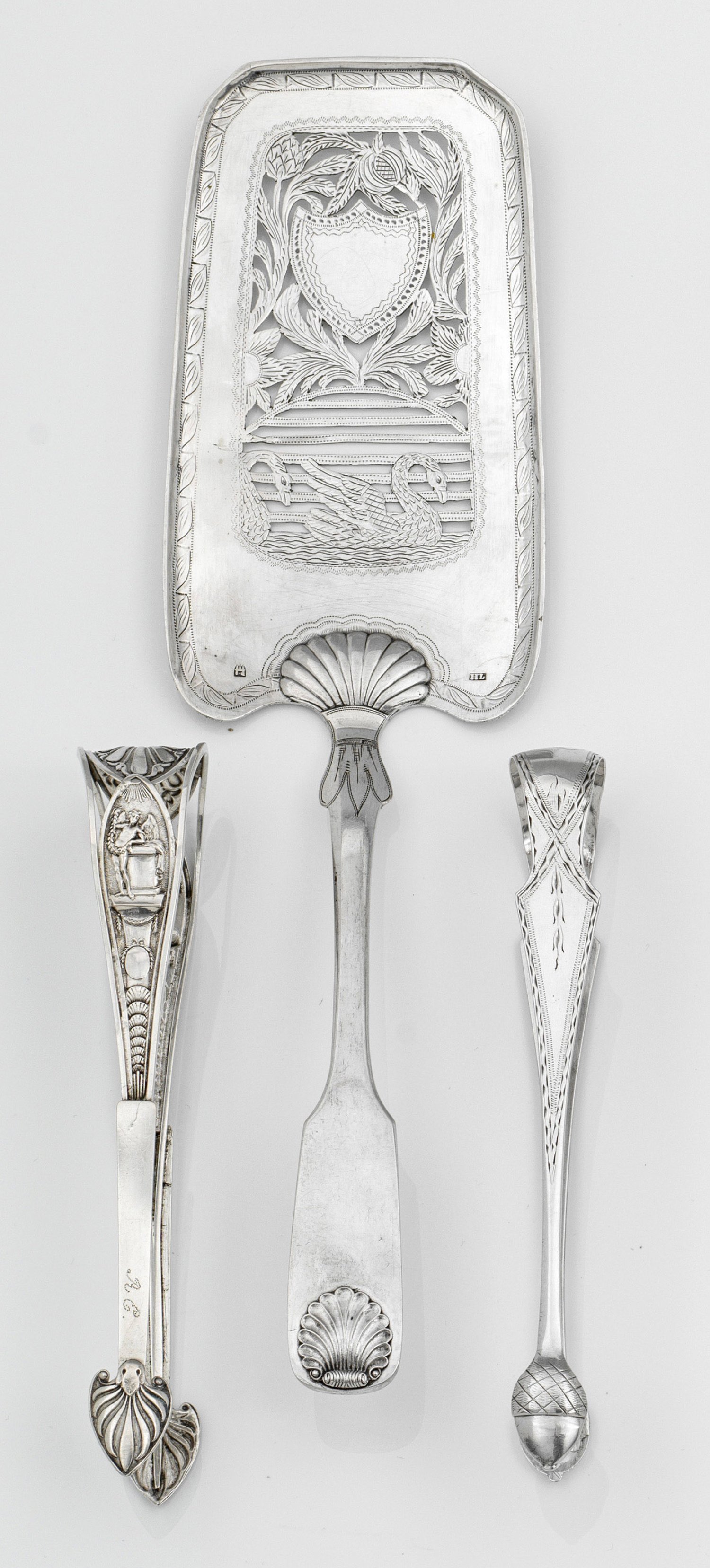 Silber. Länglicher, rechteckiger Heber mit abgeschrägten Ecken, floral durchbrochen gearbeitet mit Wappenkartusche und zwei Schwänen. Spatenförmiges Heft mit Muscheldekor. Die Zangen mit feinem Linear- und Empiredekor verziert. Teilw. gest., Beschauzeichen, Meister Ferdinand Heinrich Laberentz (tätig ab ca. 1826). Gew. zus. ca. 150 g. L. 15 cm - 29,5 cm.