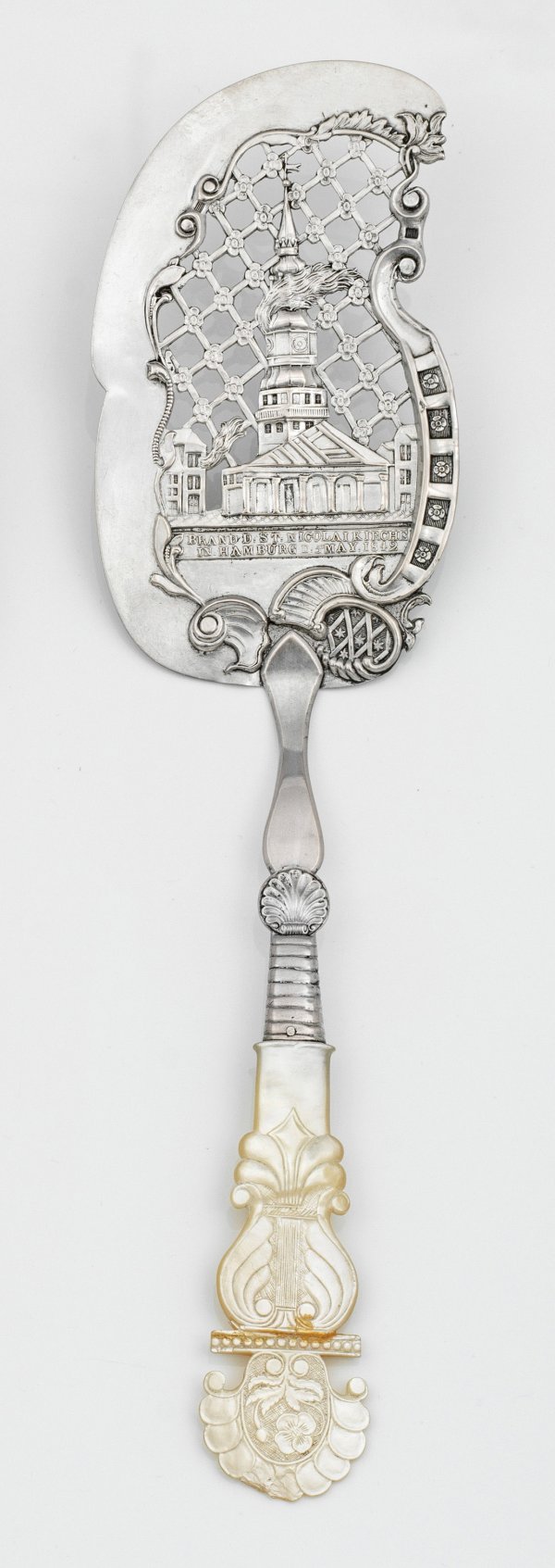 Silber, Perlmutter. Passig geschweifter, netzgitterähnlich durchbrochen gearbeiteter Heber mit bez. Darstellung des Brandes der St. Nicolai Kirche in Hamburg im Jahre 1842. Griff aus geschnittenem, volutiertem Perlmutter. Rep.; Gest. 12 Lot, unbekannter Meister "HK(?)". Gew. ca. 90 g. L. 23 cm.