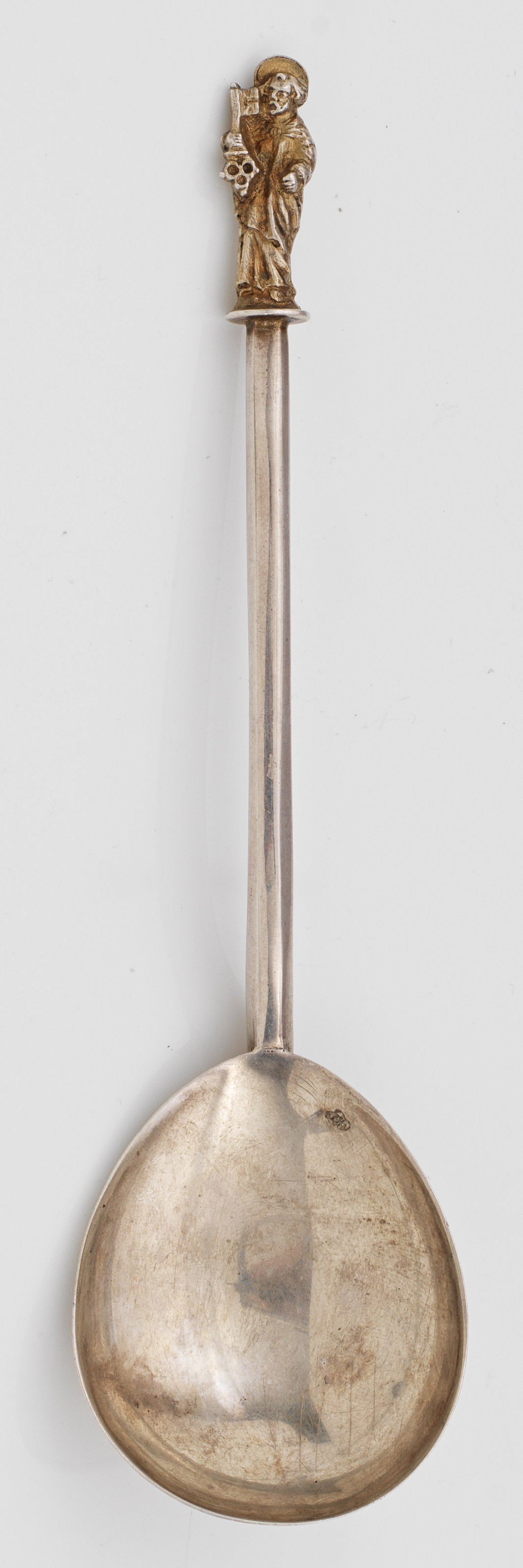 A probably Swiss parcel-gilt silver spoon with depiction of apostle. Indistinctly marked.