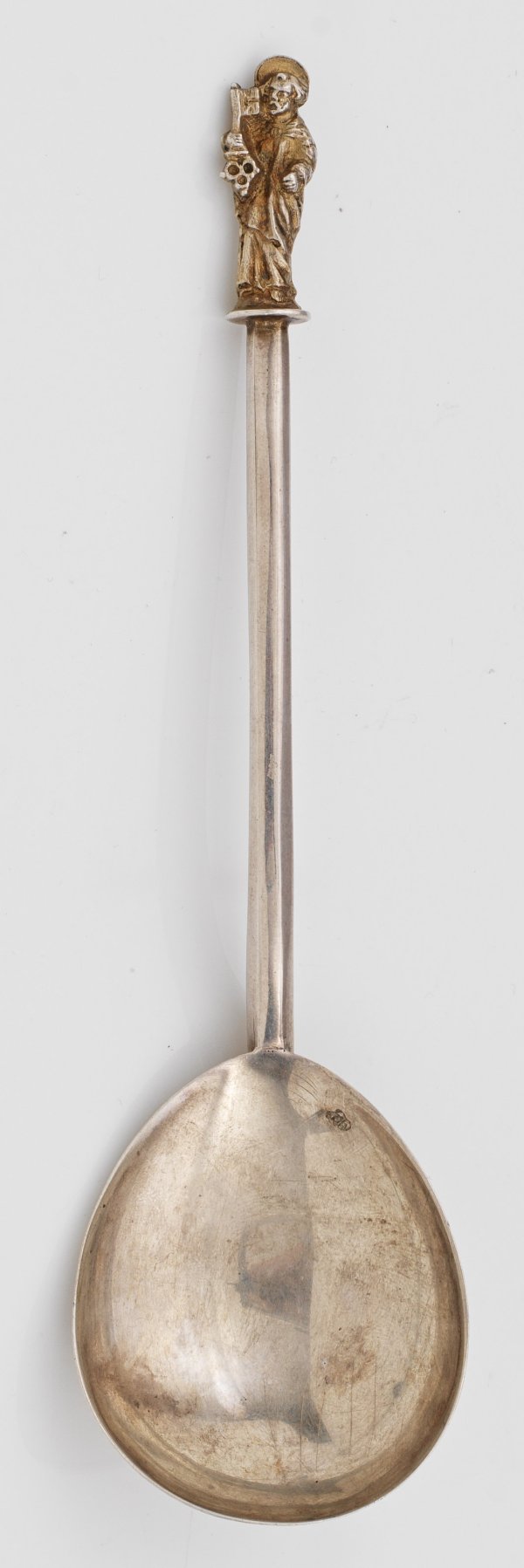 Silber, teilw. vergoldet. Nahezu runde, gering gemuldete Laffe. Schmaler leicht gekanteter Griff, übergehend in vollplastische Apostelgestalt des Heiligen Petrus. Undeutlich gest.; Gew. ca. 35 g. L. 18 cm.