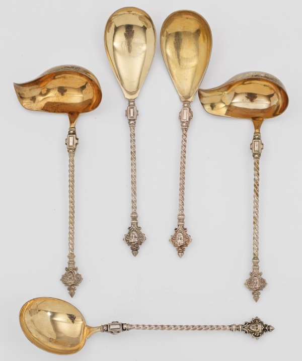 A German Historicism 5-piece parcel-gilt silver serving cutlery. Standard mark 800, maker´s and dealer´s mark.