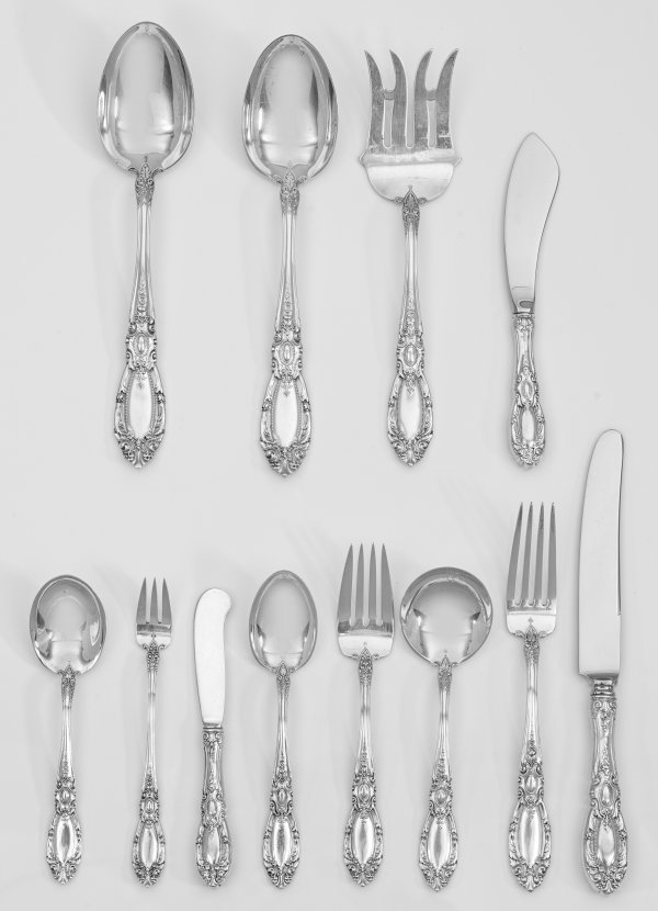 Sterlingsilber. 89-tlg.; 12 Speisemesser, 12 -gabeln, 12 Bouillonlöffel, 12 Buttermesser, 12 Dessertgabeln, 12 Kuchengabeln, 12 Teelöffel, drei Vorlegelöffel, Vorlegegabel, Weichkäsemesser. Sich konisch erweiterndes Heft, reich verziert mit reliefplastischen, volutierten Blättern und Blüten, sog. "King Richard"-Dekor. Edelstahlklingen. Gest., Sterling, "Pat. 1932", Herstellerzeichen. Gew. zus. ca. 4685 g (Gew. ohne gefüllte Teile ca. 3100 g).