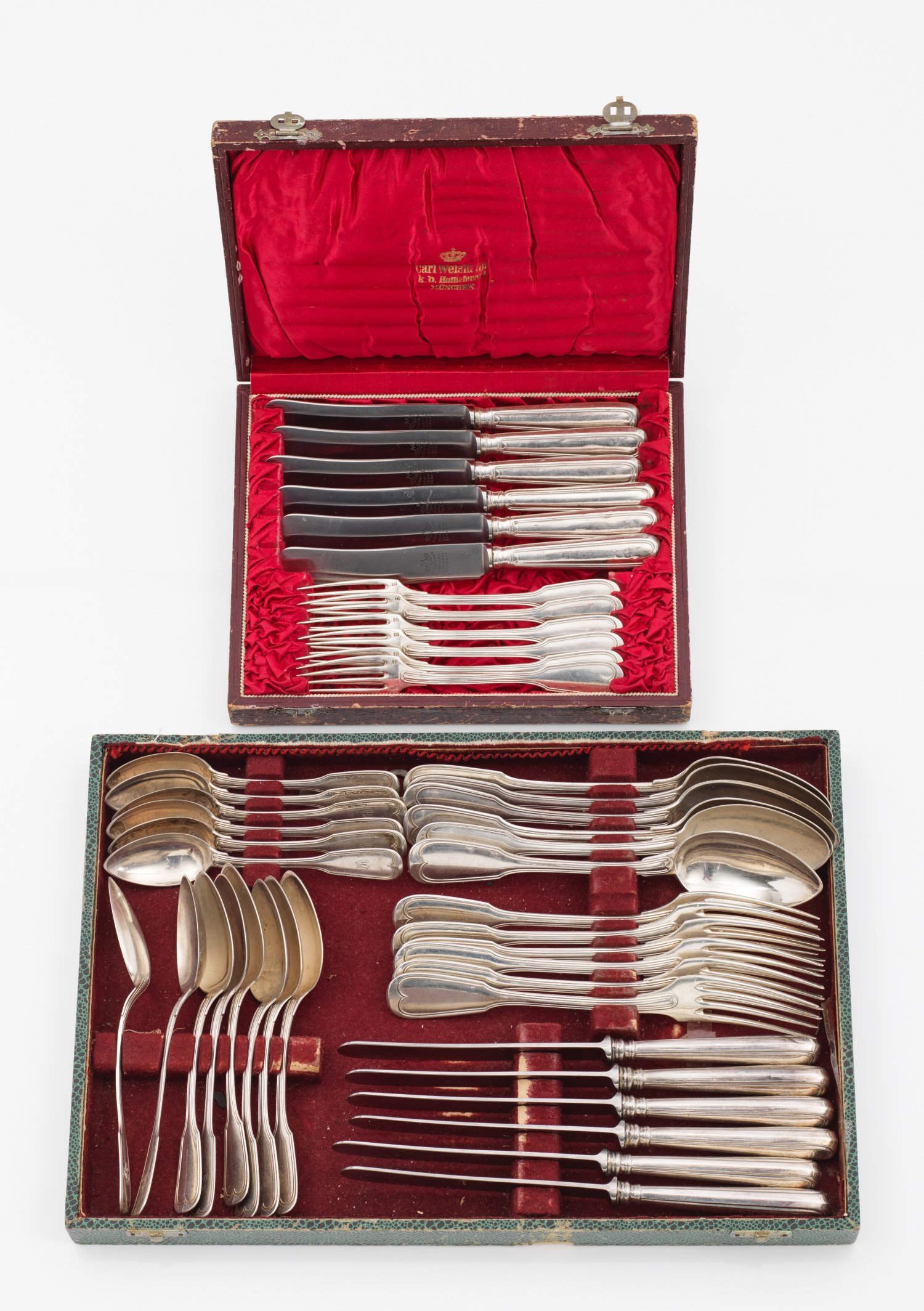 Silber. Teilw. in Etui. 44-tlg.; 6 Speisemesser, 6 -gabeln, 6 -löffel, 6 Dessertmesser, 6 -gabeln, 8 -löffel, 6 Teelöffel. Modell Augsburger Faden. Konischer, randprofilierter Griff, auf dem Heft teilw. unterschiedliche, gravierte Monogramme. Stahlklingen erneuert. Gest. 800, Herstellerzeichen. Gew. zus. ca. 2445 g (Gew. ohne gefüllte Teile ca. 1465 g).