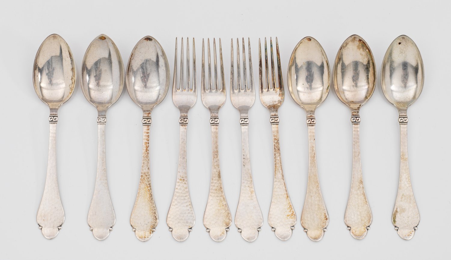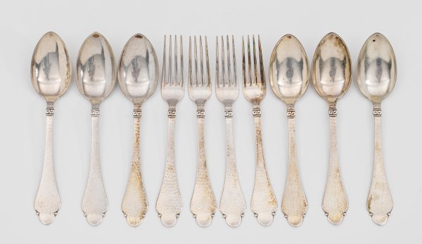Silber. 10-tlg.; 6 Speiselöffel, 4 -gabeln. Spitzovale Laffe, übergehend in konisches, am Ende dreipassig geschweiftes Heft, verziert mit Volute und Hammerschlagdekor. Gest., Beschauzeichen mit Dat., Beschaumeister Johannes Siggaard sowie Christian F. Heise, Meister Hans Christian Siiger (tätig ab 1913). Gew. zus. ca. 400 g. L. 20,5 cm.