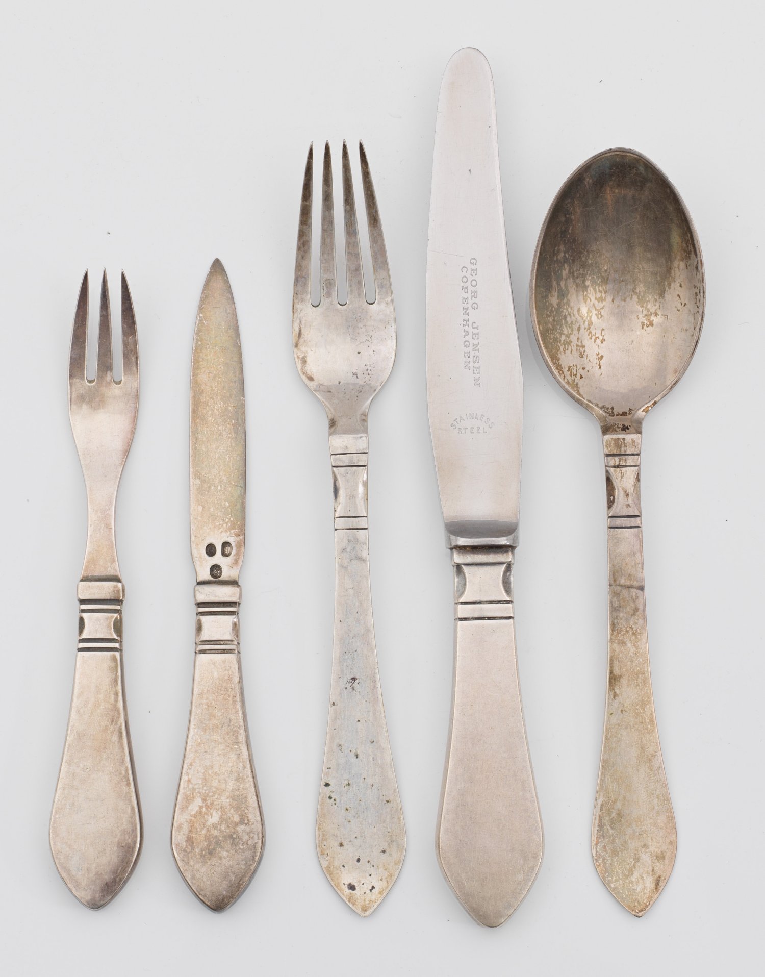 A mixed 26-piece Danish silver cutlery modelled by Georg Jensen, 1906. Minor age-related signs of use. Standard mark 830, partly assay, assay master´s and maker's mark.