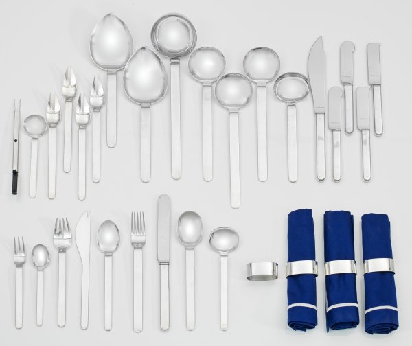 Plated. 110-tlg.; 12 Speisemesser, 12 -gabeln, 12 -löffel, 8 Fischmesser, 8 -gabeln, 8 Bouillonlöffel, 8 Dessertlöffel, 10 Kuchengabeln, 10 Teelöffel, 18 Vorlegeteile, u. a. Suppenkelle, Saucenschöpfer, Vorlegelöffel, Käsemesser sowie vier glatte Serviettenringe, dazu drei Servietten. Moderne Form mit glattem, gerundetem Griff, Dekor "Epoca". Edelstahlklingen. Gem., Herstellerzeichen, "150".