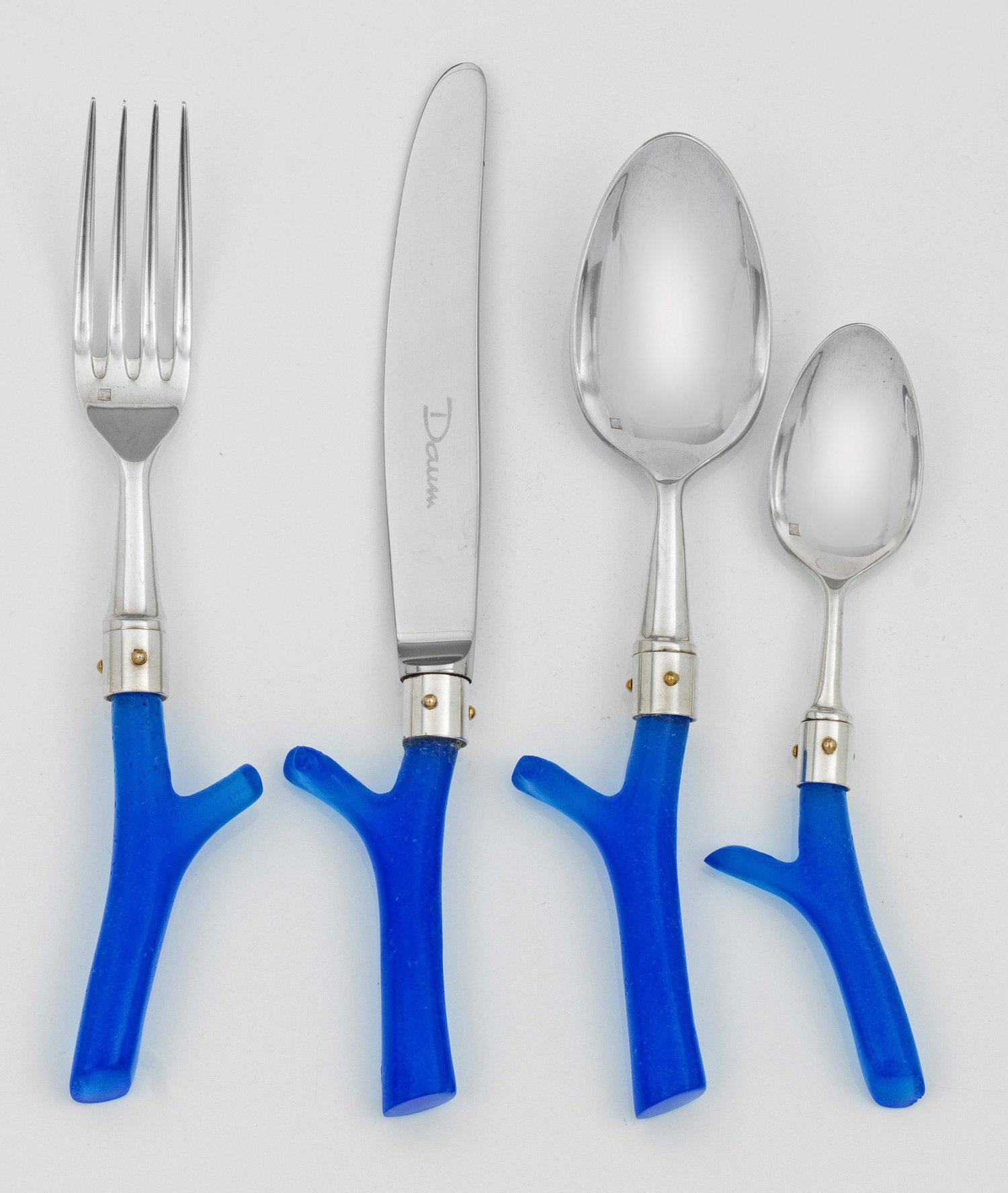 Metall, versilbert und blaues Glas in sog. Pate-de-verre-Technik. 4-tlg.; Speisemesser, -gabel, -löffel und Teelöffel. Von breitem Ring mit vergoldeten Nieten gefasster, vegetabil gestalteter Griff in Form von stilisierten Korallenästen aus azurblauer Glaspaste. Klinge aus Edelstahl. Aus der Kollektion "Trapani", 1989. Messer rep.; Gest., sign. "Daum". L. 15 cm x 21 cm.