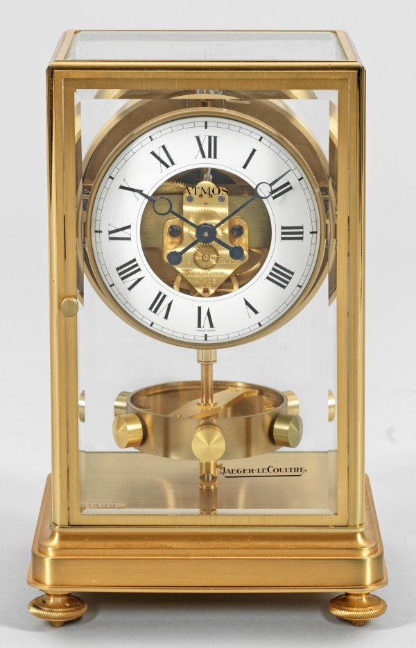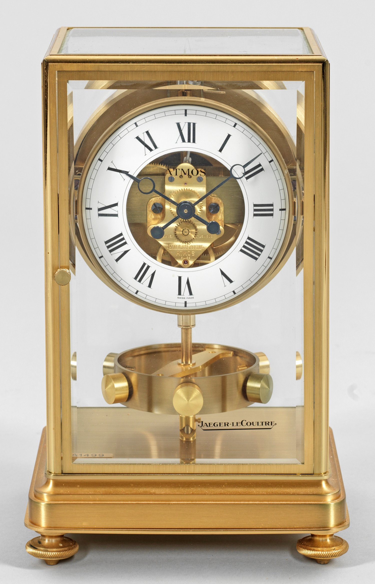 sog. "Pendule Perpetuelle". Vergoldetes Messing. Allseitig verglaster, hochrechteckiger Korpus auf Profilsockel und gedrückten Balusterfüßen. Profilgerahmter weißer Ziffernring mit schwarzen römischen Zahlen. Bez. ATMOS, Jaeger LeCoultre sowie Plakette mit No.1499. Rotationspendel. H. 27 cm. 17 cm x 15,5 cm.