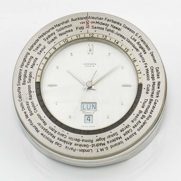 sog. Weltzeituhr. Messing, vernickelt. Rundes, schräggestelltes Gehäuse mit satiniertem Zifferblatt, Monats- und Datumsanzeige, bez. HERMÈS PARIS. Breite drehbare Lünette mit diversen Ortsangaben. Quarzwerk. Herstellerzeichen. H. 4,5 cm. D. 11 cm.