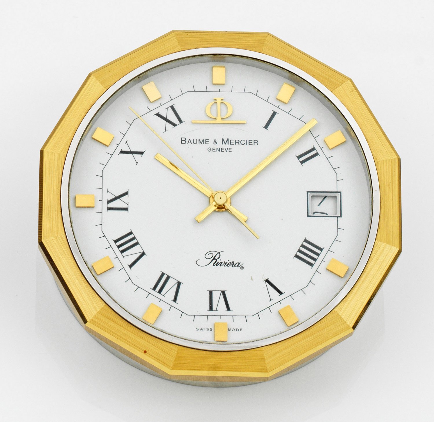 Messing und Stahl. Rundes, schräggestelltes Gehäuse mit weißem Zifferblatt, Datumsanzeige sowie polygonaler Lünette, bez. BAUME & MERCIER Geneve Riviera. Quarzwerk. Herstellerzeichen. H. 4,5 cm. D. 12 cm.