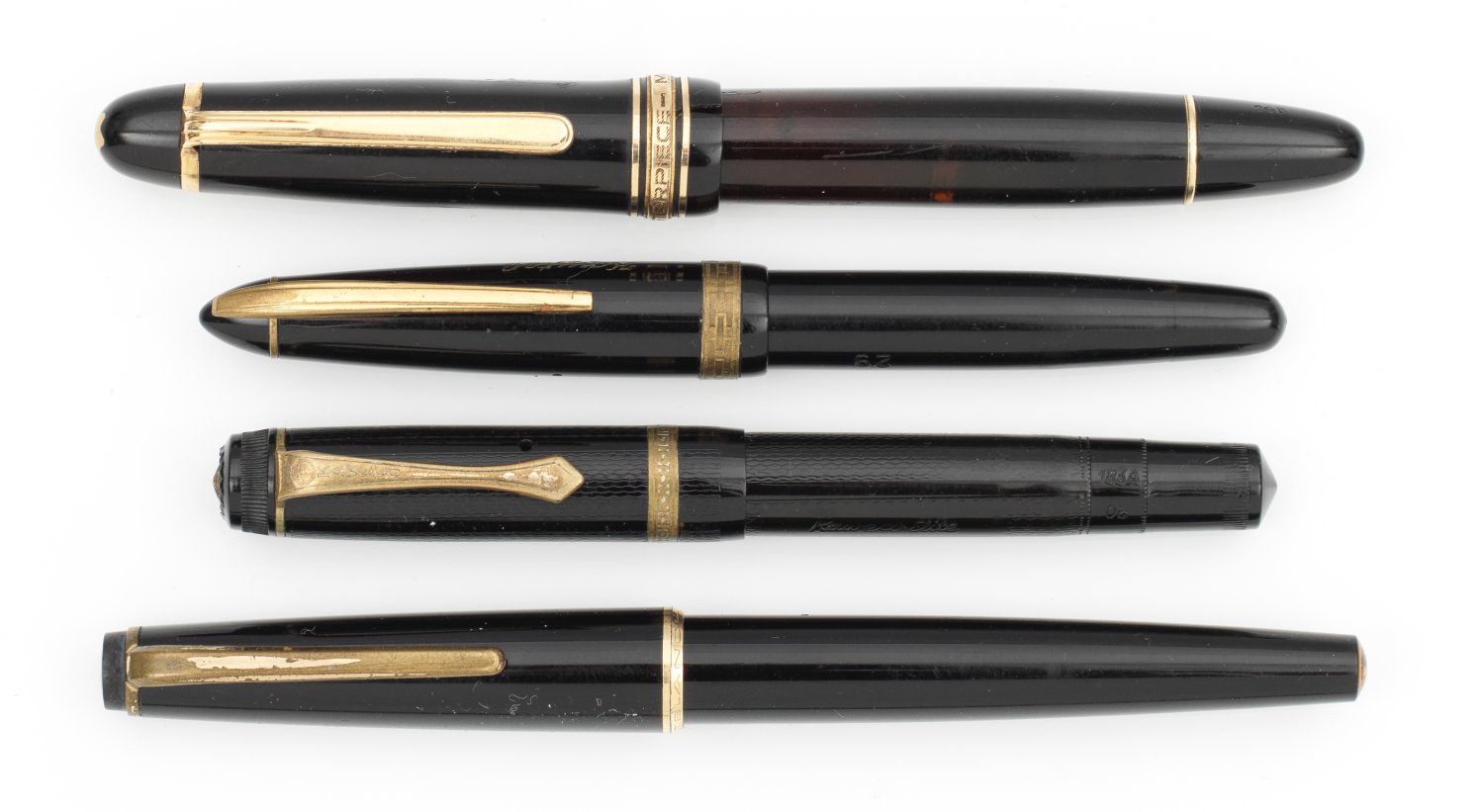 Schwarzbrauner Edelharz bzw. schwarzer Kunststoff und Metall, vergoldet. Montblanc Masterpiece Kolbenfüllfederhalter mit 14C Goldfeder, Patronenfüllfederhalter Nr. 32 von Montblanc und zwei Kolbenfüllfederhalter Kaweco Elite und Komteß. Gebrauchsspuren und teilw. besch.;
