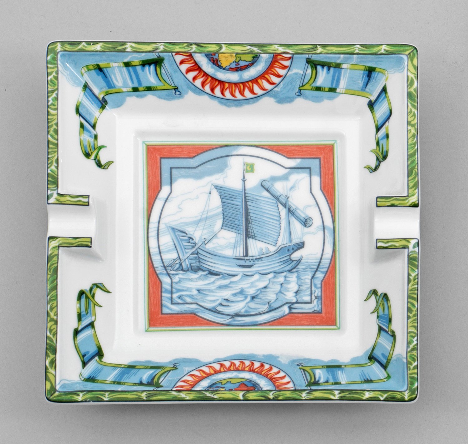 Quadratische, gemuldete Form. Im Spiegel Darstellung eines Schiffes auf Wellen, sog. Dekor "Alizés" aus der Serie "Patchwork". Randdekor mit Fahnen und Sonne sowie umlaufender Bordüre. Firmenmarke. H. 4 cm. 16,5 cm x 16,5 cm.
