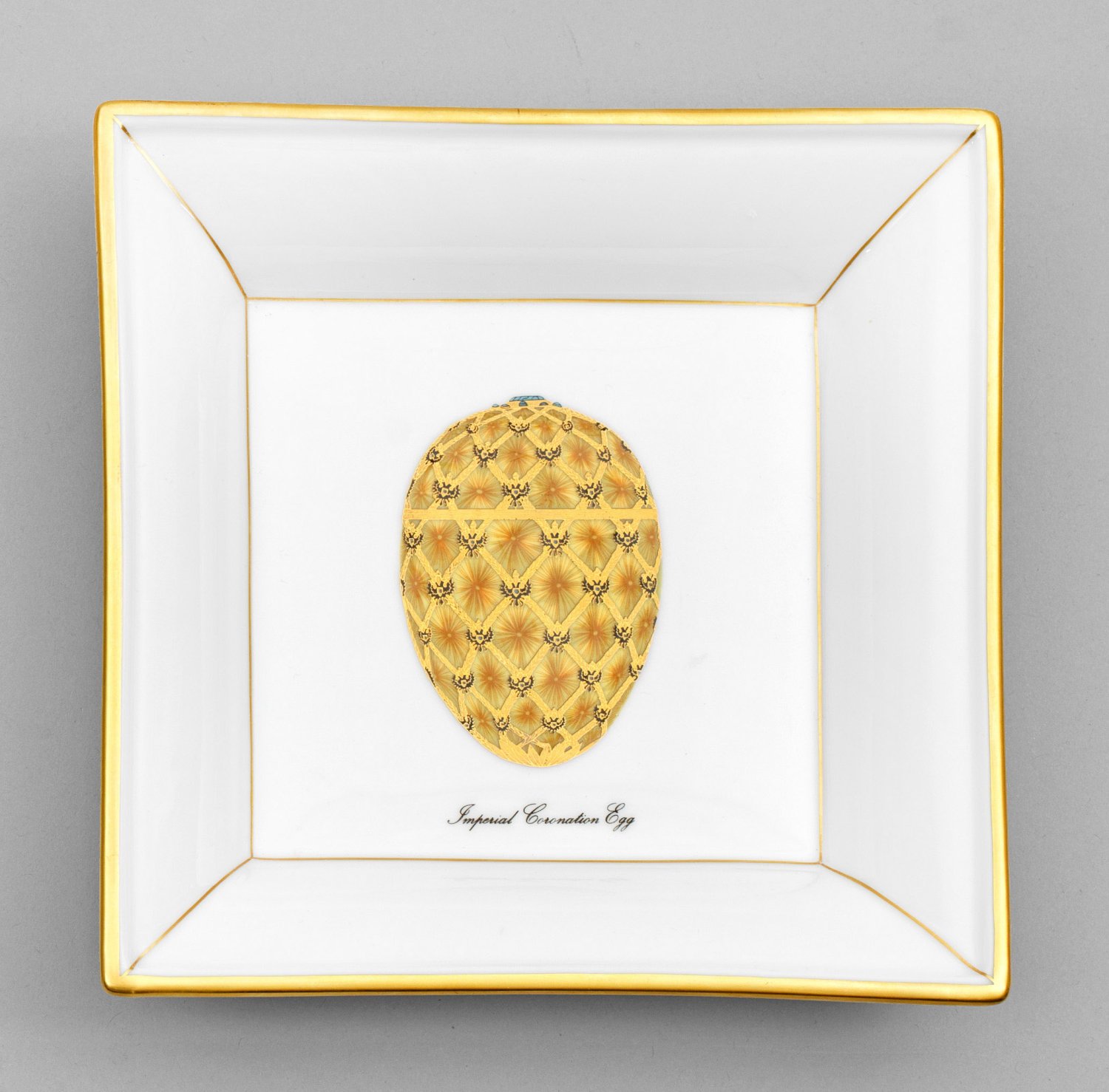 Quadratische, weit ausschwingende Form. Im Spiegel Darstellung des zaristischen Ostereis aus dem Jahr 1897 von dem russischen Juwelier Peter Carl Fabergé. Goldrand. Manufakturmarke. H. 4 cm. 18 cm x 18 cm.