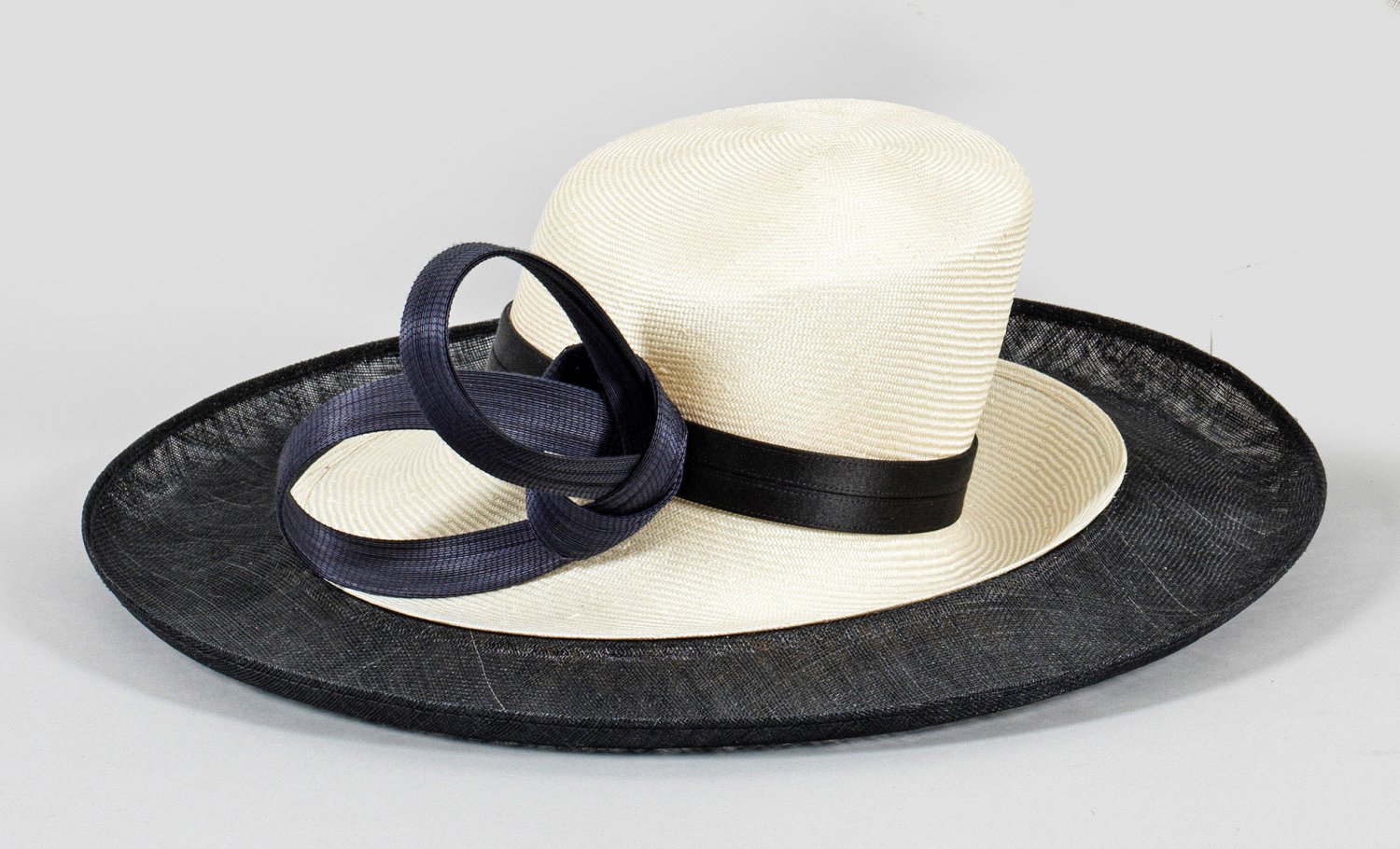 Naturfarbener sowie schwarzer und marineblauer Bast, fein geflochten. Asymmetrisch gestalteter Hut mit breiter Krempe und großem Schleifenmotiv. Herstelleretikett "Philip Treacy London".