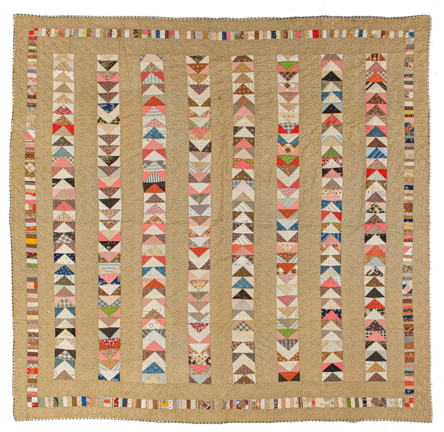 Unterschiedlich polychrom gemusterte und strukturierte Baumwollstoffe, handgenäht. Auf beigefarbenem Fond mit dichter, cremefarbener Rankenmusterung, flächendeckender Dekor aus gegenläufigen Zackenbändern sowie umlaufend schmaler Rahmung. Wattiert. Rückseite mit Karo-Muster. 190 cm x 190 cm.