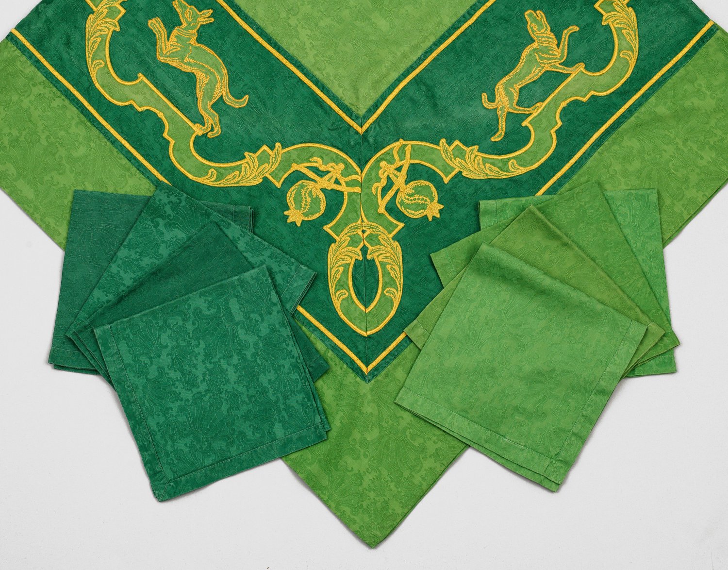 9-tlg; Quadratische Tischdecke und acht Servietten. Baumwolle. Auf hellgrünem Fond breite, dunkelgrüne Rahmung aus gelb umrandeten Volutenmotiven und Jagdhunden. Je vier Servietten in unterschiedlichen Grüntönen. Herstellerzeichen. Gebrauchsspuren. 153 cm x 153 cm bzw. 44 cm x 44 cm.