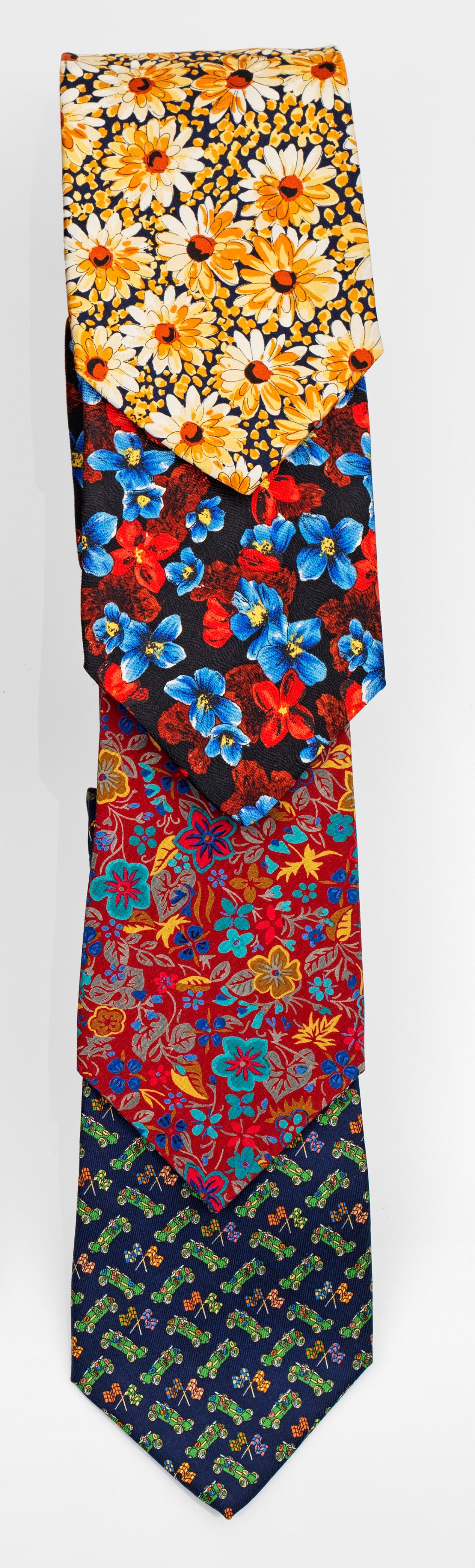 Seide. Unterschiedliche, polychrom gestaltete Blütenmuster auf dunkelblauem, bordeauxrotem und schwarzem Fond sowie grüne Rennwagen im Rapport auf blauem Fond. Herstellerzeichen. Getragen.